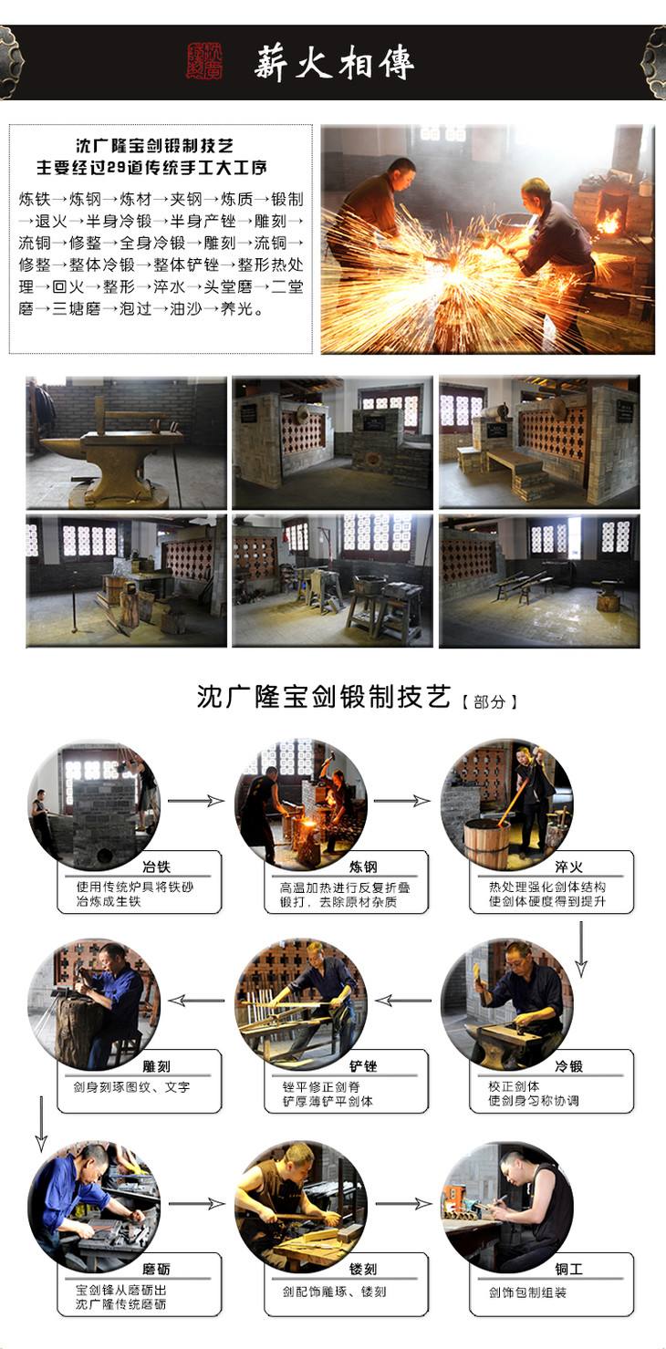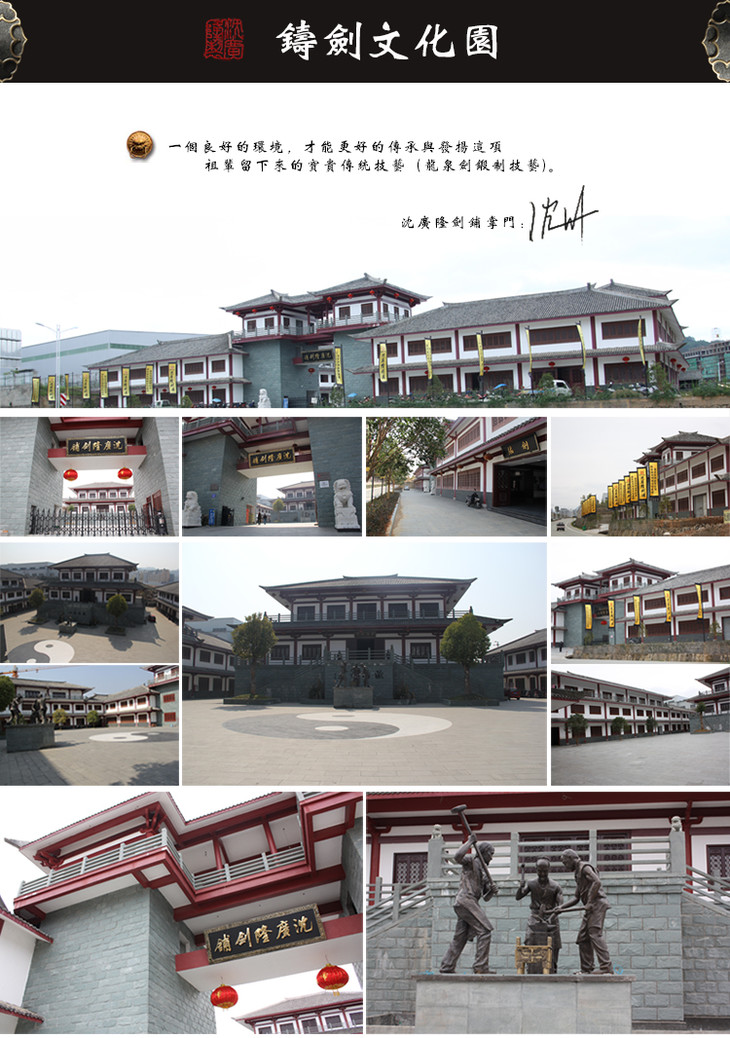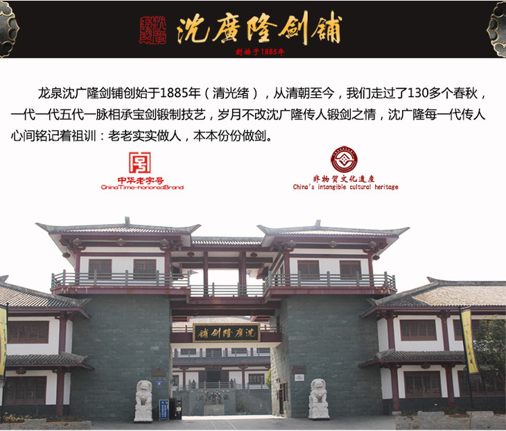 - 龙泉沈广隆剑舖创始于1885年(清光绪)位于浙江省龙泉市,是当地唯一一家“子承父业”一脉相承的中华老字号宝剑生产企业,是国家级非物质文化遗产龙泉宝剑项目保护单位,并以“天下第一剑”闻名于海内外....