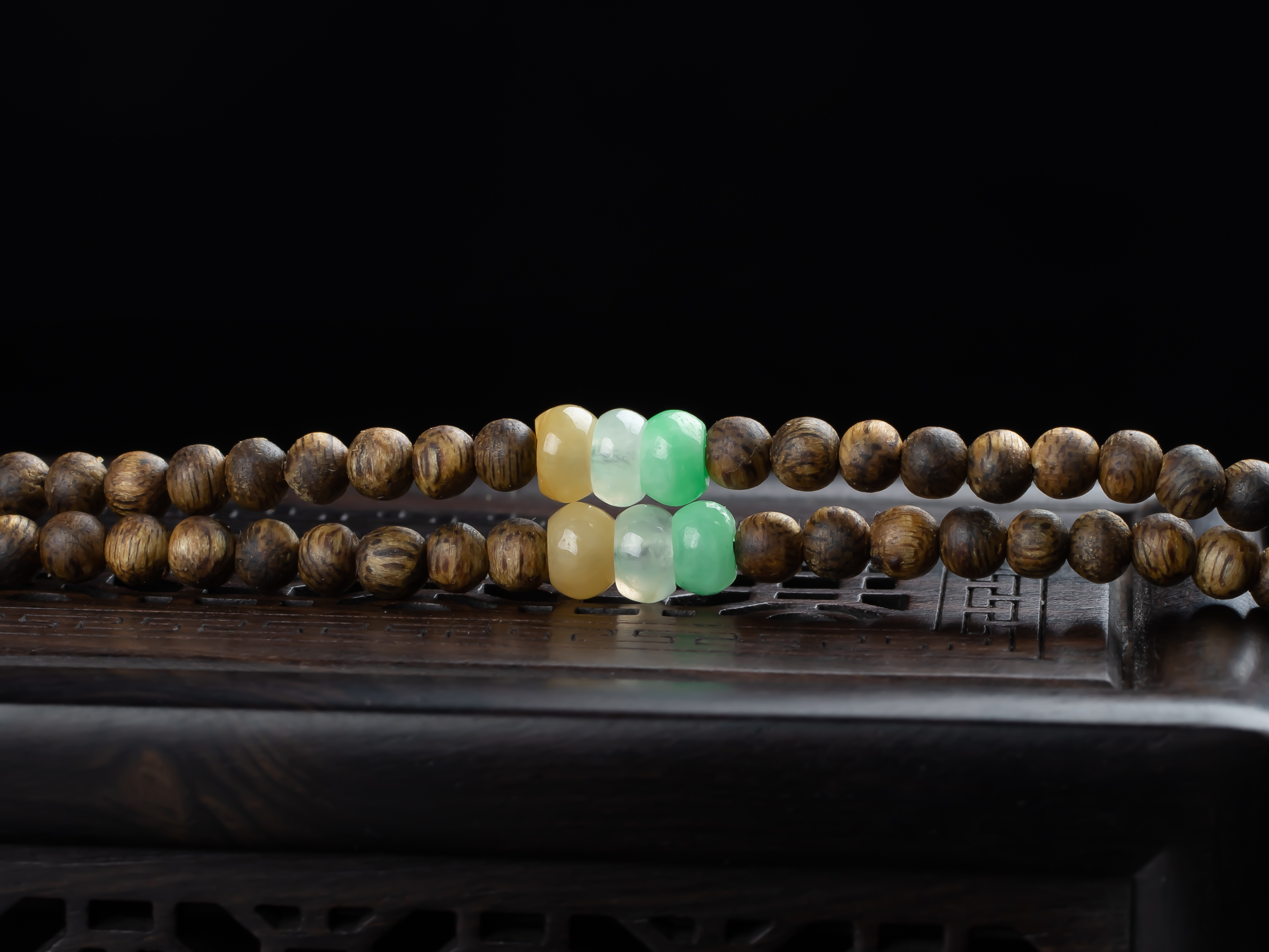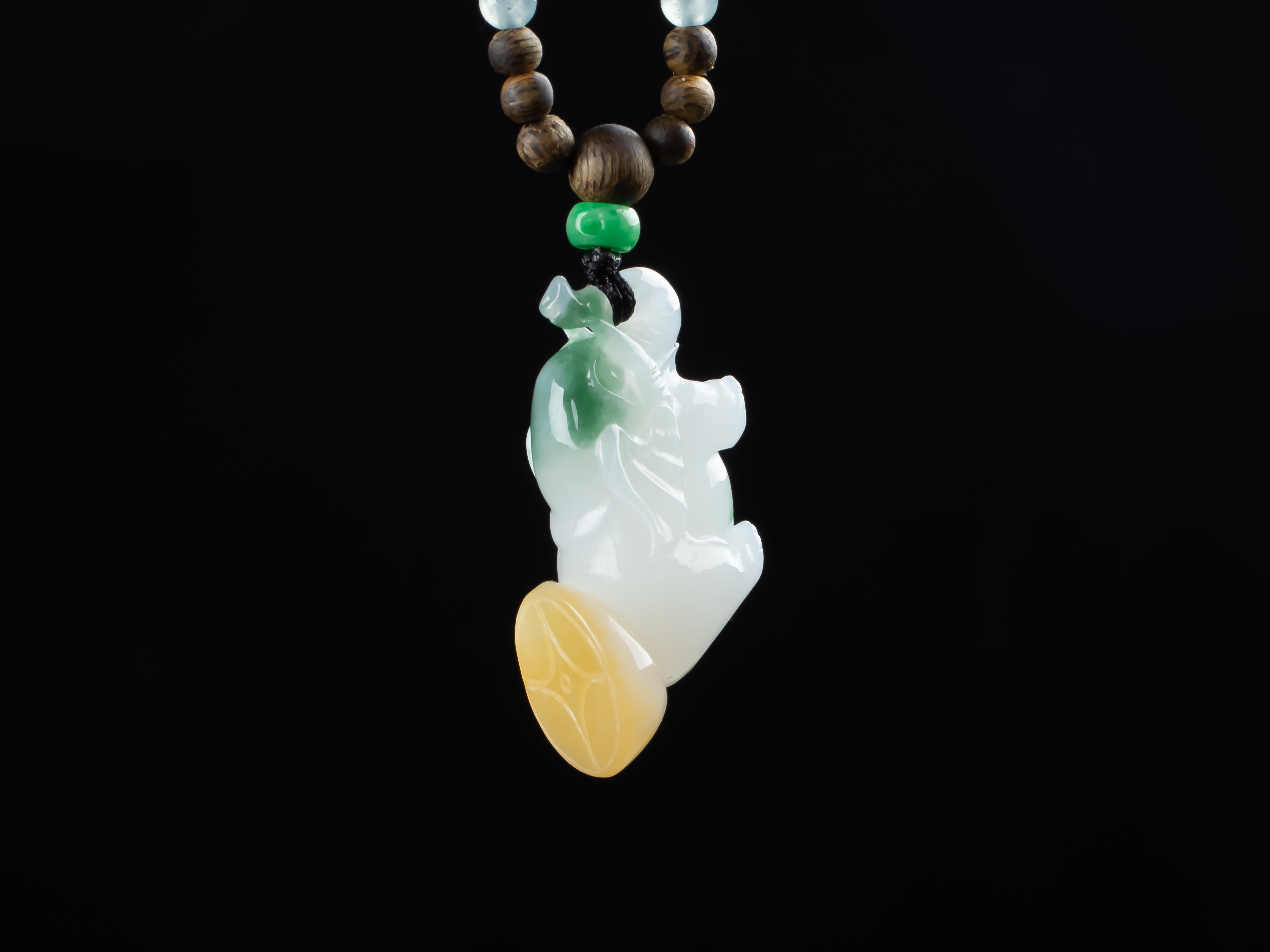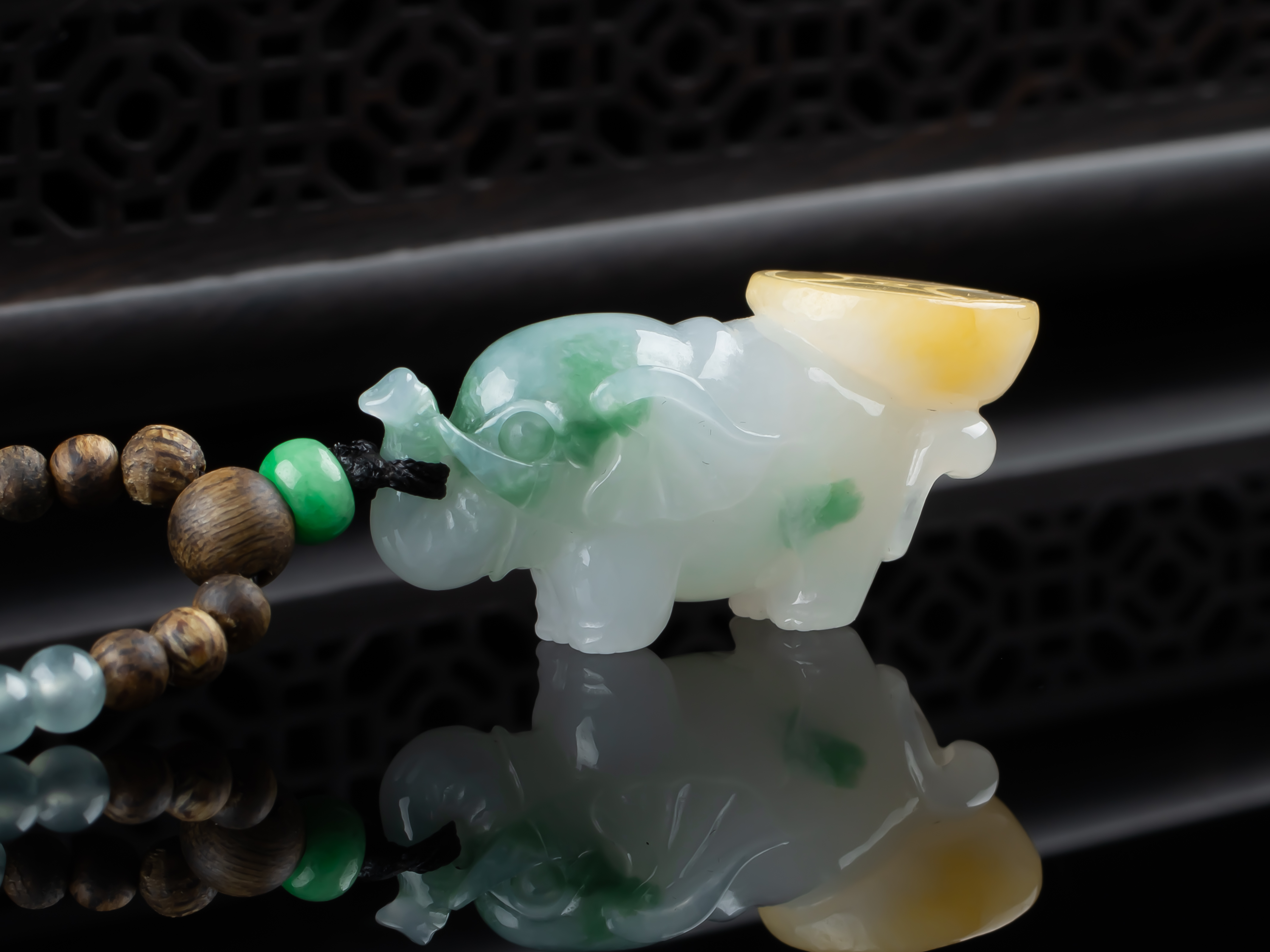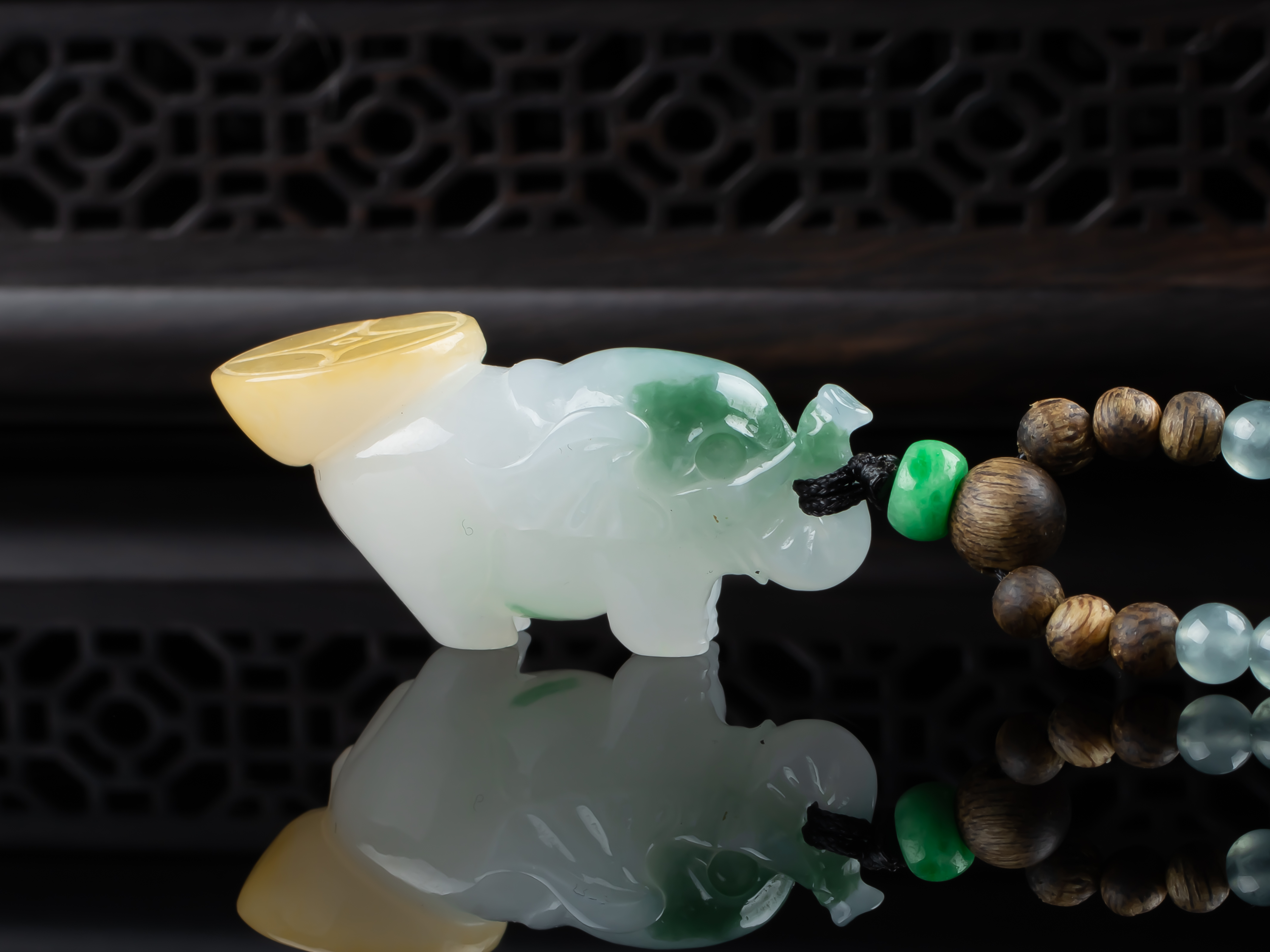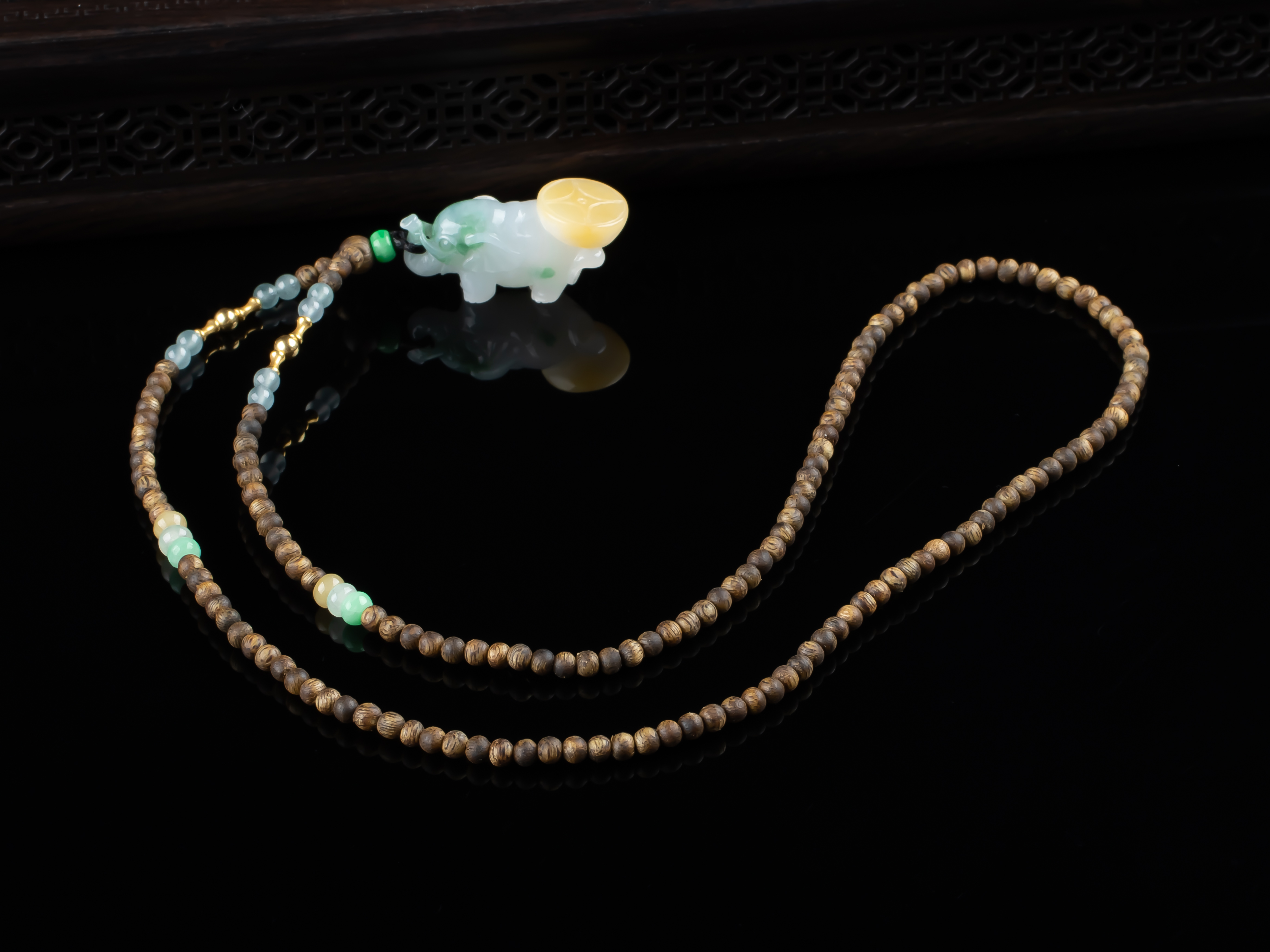 XY0116 沉香+双彩冰糯翡翠小象挂件,天然沉香圆珠4.8mm,原色原味,香味自然清甜。18K穿搭,一只双彩色翡翠小象约35x17x12mm,水润细腻,利用黄色巧雕铜钱,象寓意着太平有象,招财纳福!