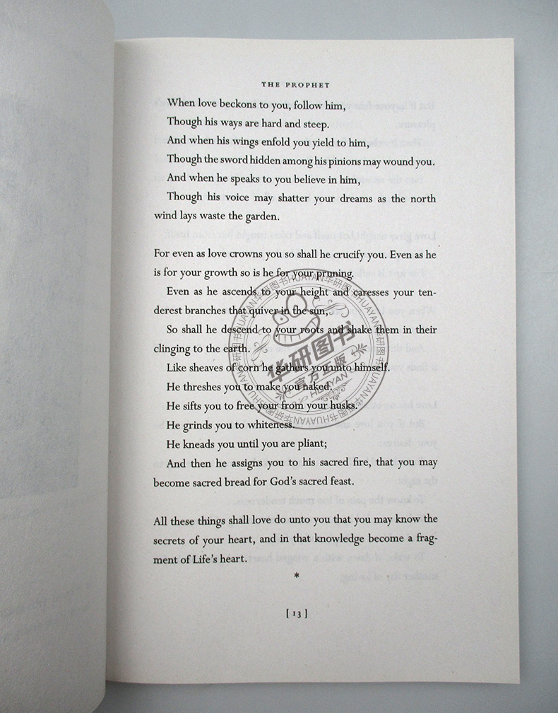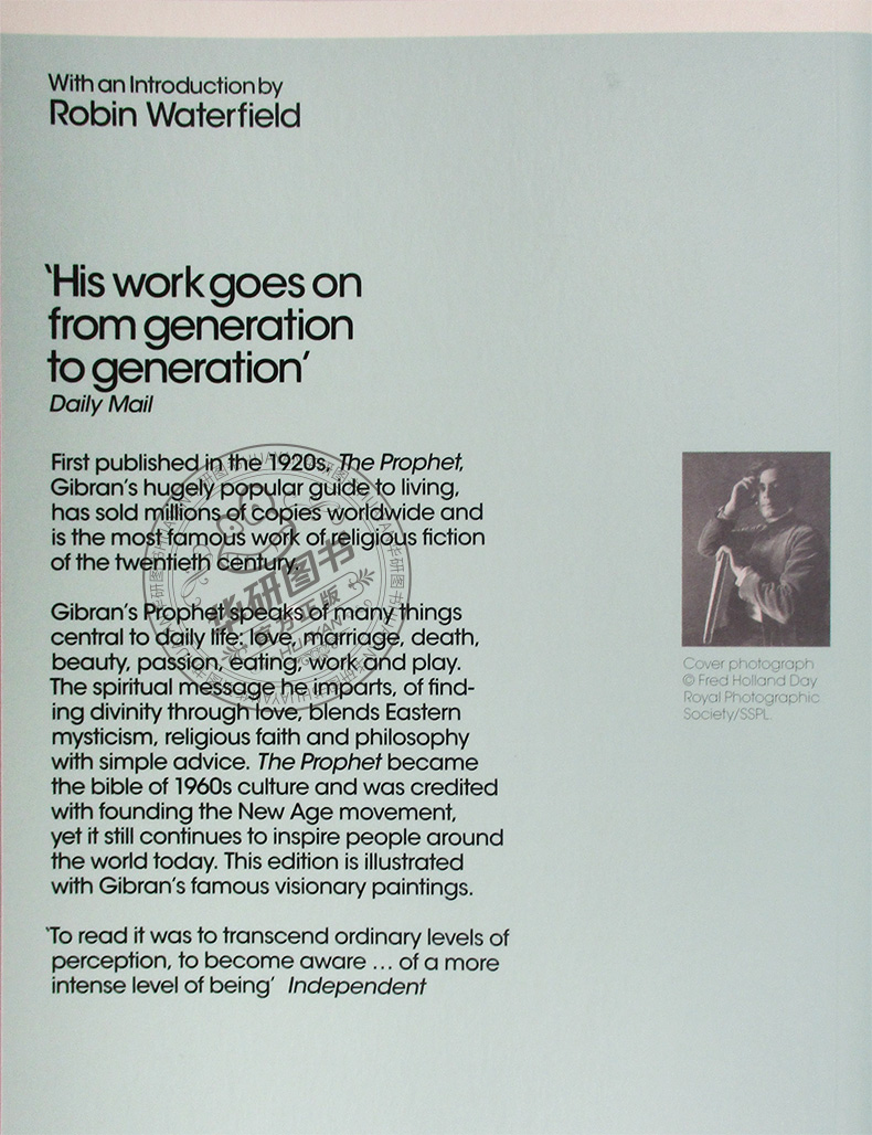The Prophet《先知》为黎巴嫩诗人哈里利·纪伯伦的代表作品,以英文诗体构成。书中借由主人翁先知阿穆斯塔法之口,阐述人生哲理,包括爱、自由、孩子、法律、善恶等26个主题。本书被称为“东方赠送给西方很好的礼物”。