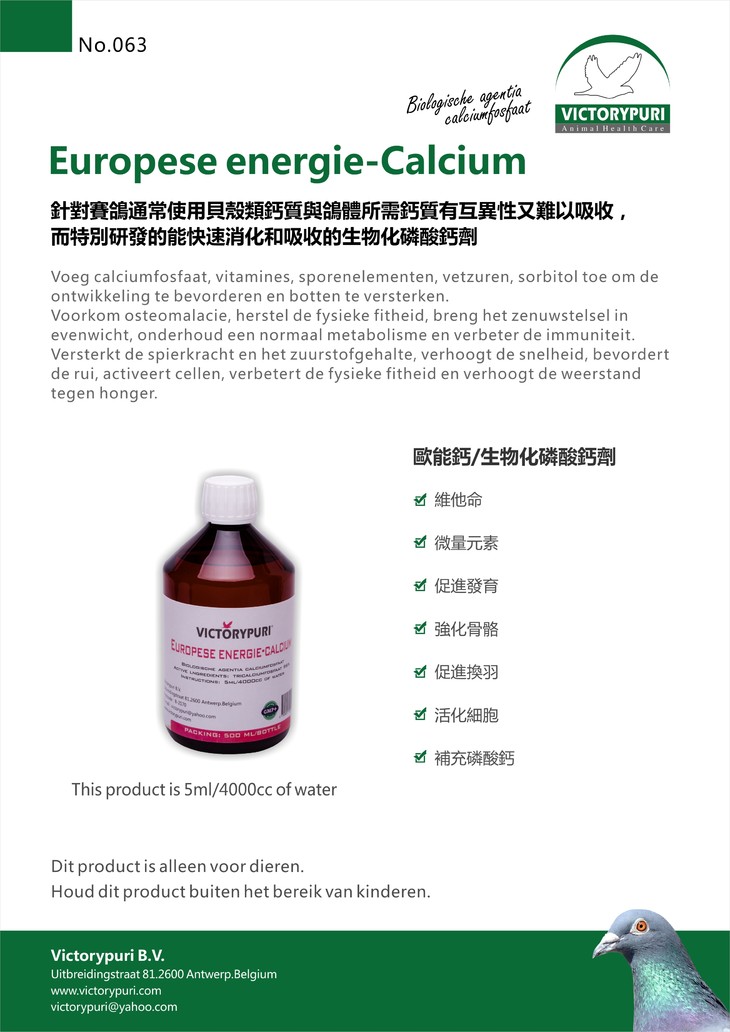 “欧能钙”由比利时Victorypuri捷普瑞国际有限公司针对赛鸽日常饲养饲料中无法提供足够“钙质”来源,且通常使用贝壳类钙质与鸽体所需钙质有互异性又难以吸收,选手鸽缺钙会导致神经系统衰竭影响比赛成绩,而特别研发的能快速消化和吸收的生物化磷酸钙剂。本品富含多种维他命,微量元素,磷酸钙,促进磷钙在赛鸽体内的迅速转化,磷钙是赛鸽骨骼发育成长的最重要的物质,在营养上强化赛鸽骨骼,生物化磷酸钙可直接起到作用,即可被赛鸽体有效帮助分解,被瞬间吸收,见效快,可增强赛鸽的羽质,促进磷钙的转化,帮助消化,提高赛鸽的机能。长期使用,无耐药性,无药物残留。