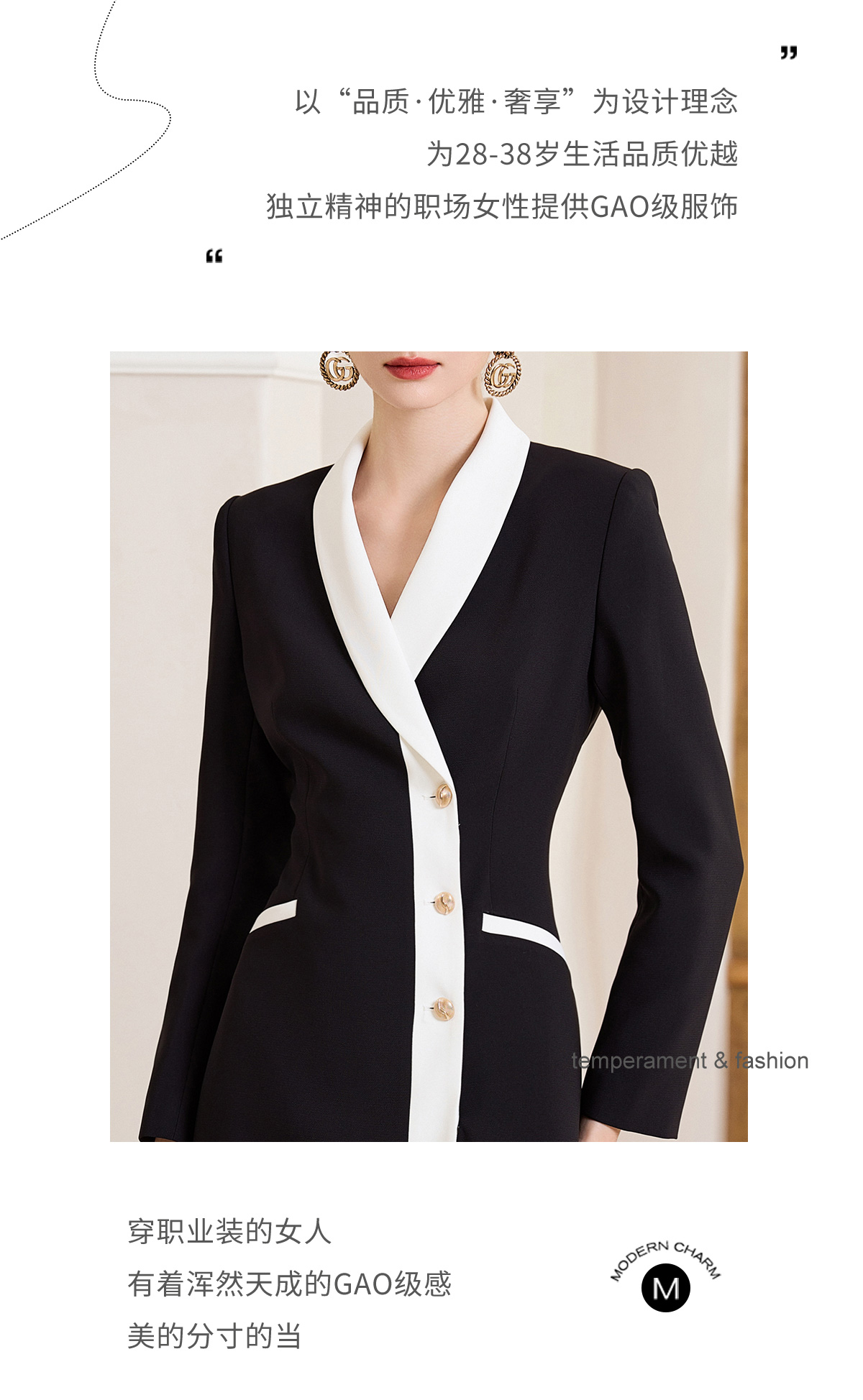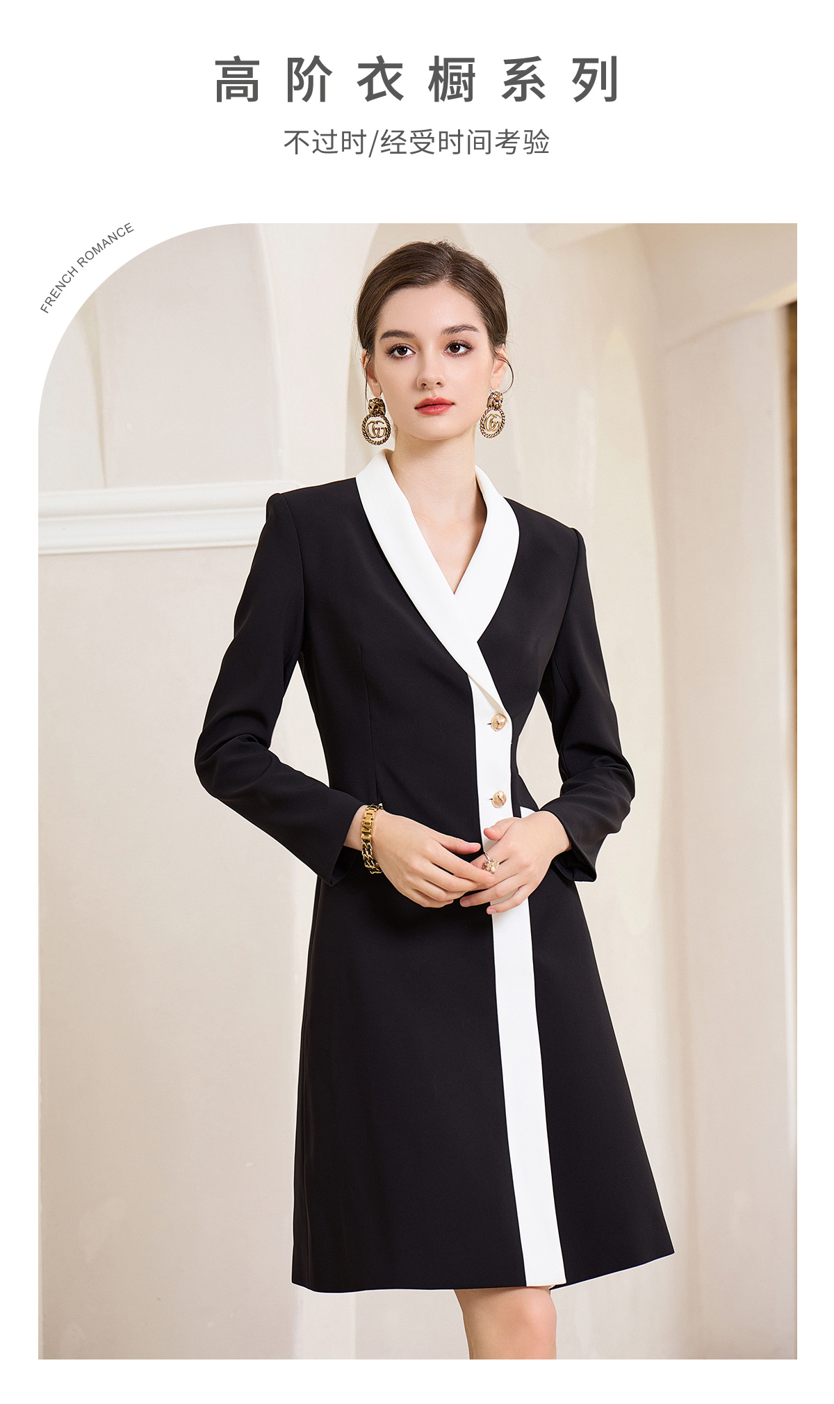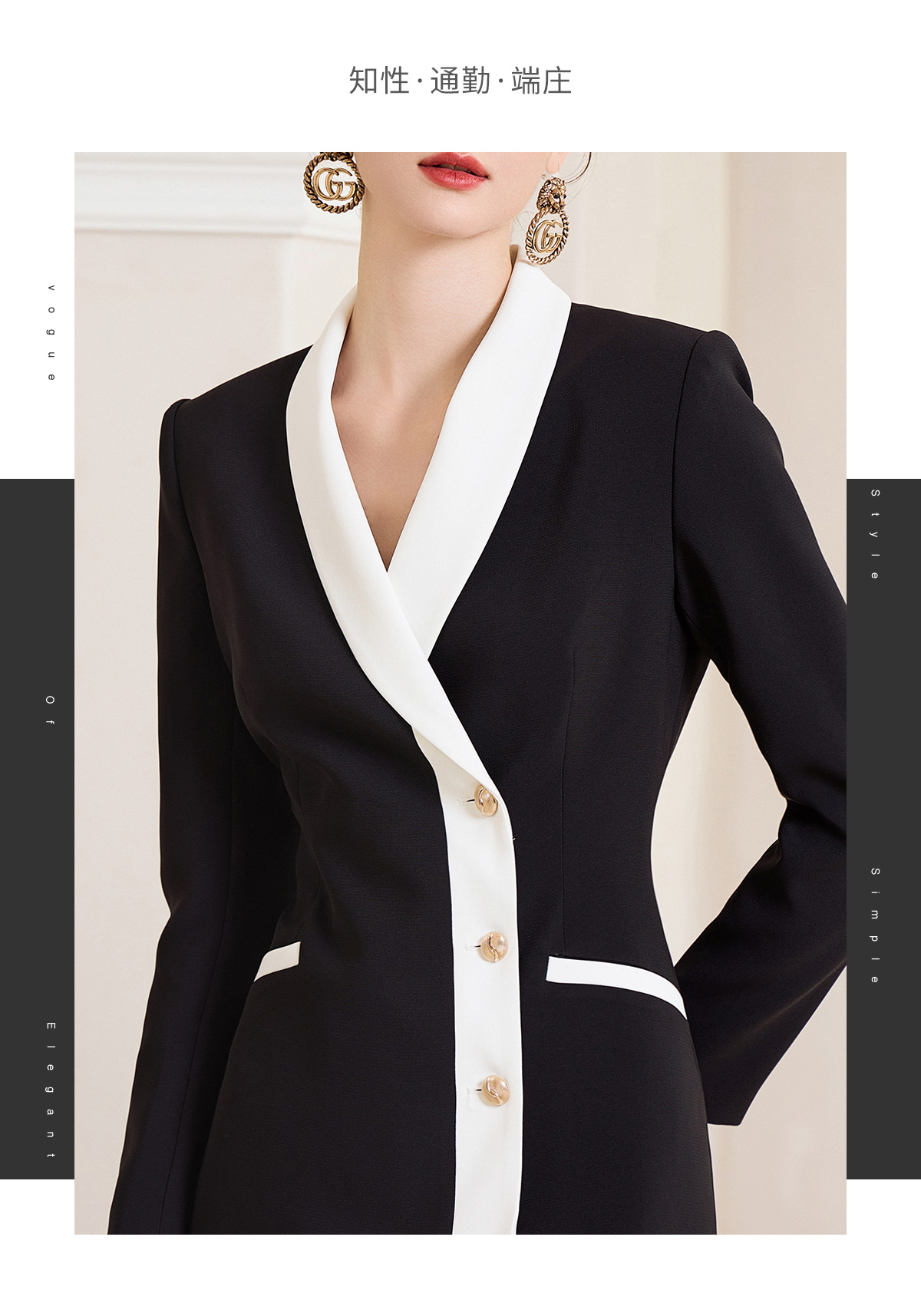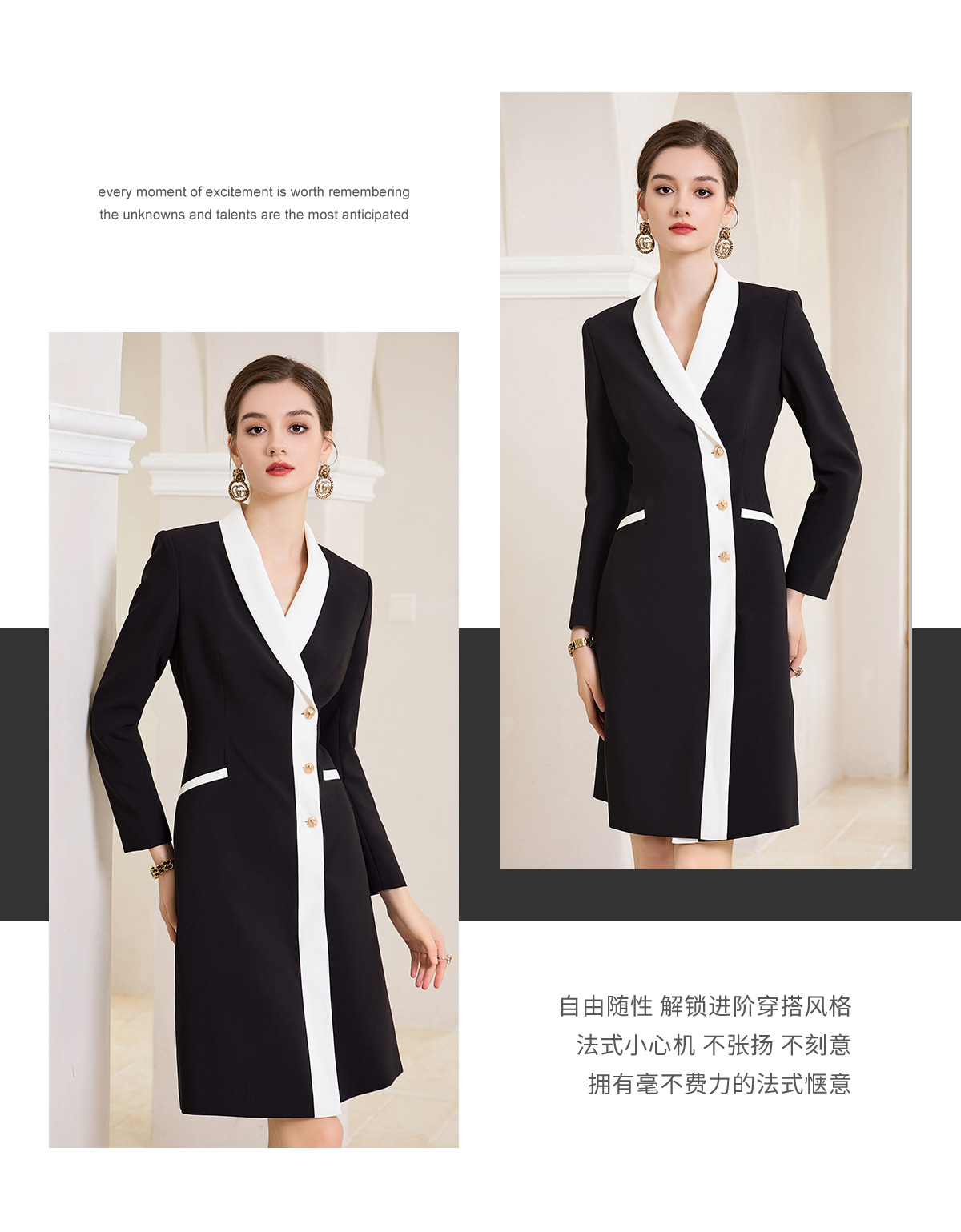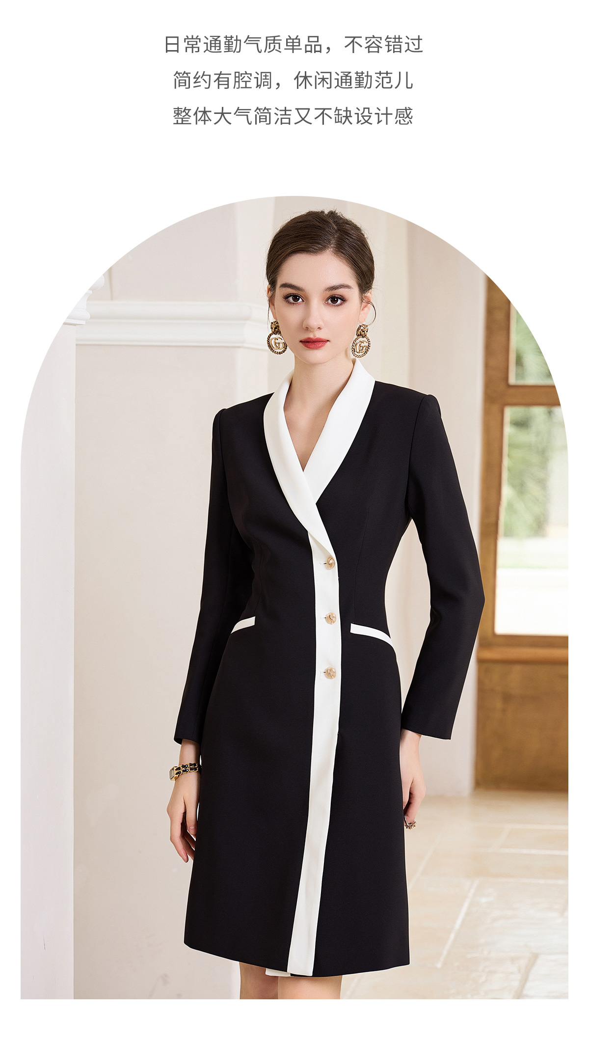 AD黑白撞色西装连衣裙女ol通勤白领职业装v领小香风正装长袖裙子