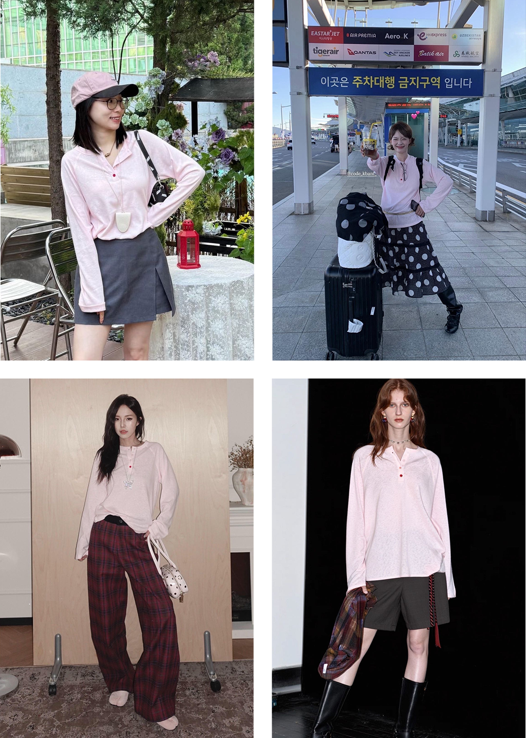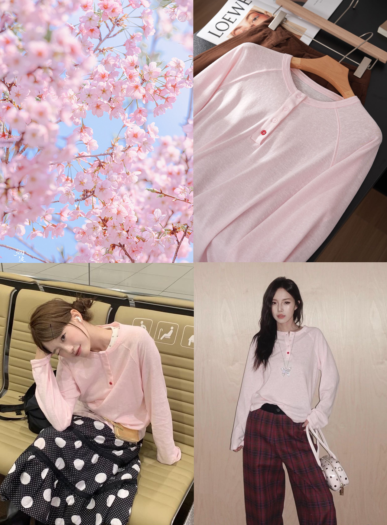 它会让人不禁想到韩剧里的樱花雨,随便搭条休闲裤/裙子,就能穿出韩系小姐姐的感觉。