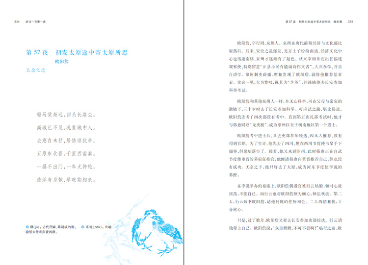 1.101首唐诗涵盖初、盛、中、晚唐72位诗人佳作。在故事中讲述诗人生平际遇、交游唱和,及诗作背景与情境。;四杰、宋之问、陈子昂、张若虚、孟浩然、王维、李白、杜甫、韩愈、白居易、柳宗元、元稹、李贺、杜牧、李商隐、罗隐,是初、盛、中、晚唐各个时期的代表性诗人,整体观之,可见唐诗发展脉络。2.大唐诗人变身为;有故事的人,演绎人生百态。从神童到囚徒的骆宾王、诗品与人品形成反差的宋之问、晚年陷入政治漩涡的李白、也曾豪情万丈的杜甫、曾为长安纨绔的韦应物、;滥情又;深情的元稹、从悯农的诗人到忘恩的达官的李绅个个显示出;固有印象之外的另面人生。上官婉儿、李冶、薛涛、刘采春、鱼玄机等女性诗人在政治漩涡或爱情生活中显示出大胆或犹疑、沉溺或决绝。3.从诗人个人史角度书写唐代大历史。杜甫因安史之乱半生颠沛流离,刘禹锡、柳宗元等人进行;内抑宦官,外制藩镇的;永贞革新却屡遭贬谪,李商隐困于朋党之争长期沉沦下僚。日本留学生朝衡与新罗留学生崔致远在中国学习、参加科举考试并做官,见证了大唐文化对日本和朝鲜半岛的辐射力。4.吸引青少年在故事中爱上唐诗。唐诗 故事,犹如水中藻荇,瞬间鲜活起来。诗歌文本以大字突出,重难点字词作注音、注释,便于记诵。正文所述唐诗故事多取材于史书与历代笔记、传记、民间传说等,可在轻松阅读中了解唐代诗人的多重面向及唐诗的创作背景。每夜一读,如睡前故事,让人着迷。5.版式考究,对开排布,双色印刷,锁线装订,可180度摊开。每篇以一至三个对开面排布,篇首空白处与篇末空白页以花鸟图或山水图点缀,增加了唐诗的画面感。