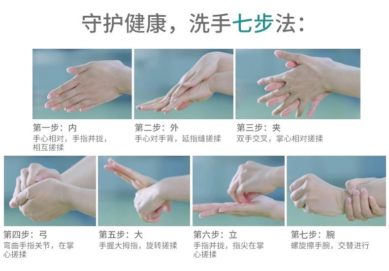 洗手掌、洗手背侧指缝、洗手掌侧指缝、洗指背、洗拇指、洗指尖、洗手腕和手臂,可总结为内、外、夹、弓、大、立、腕七个字。七步洗手法是目前比较规范且卫生的洗手方法。