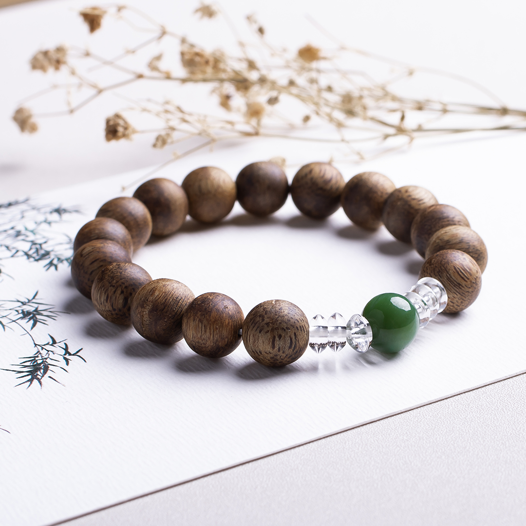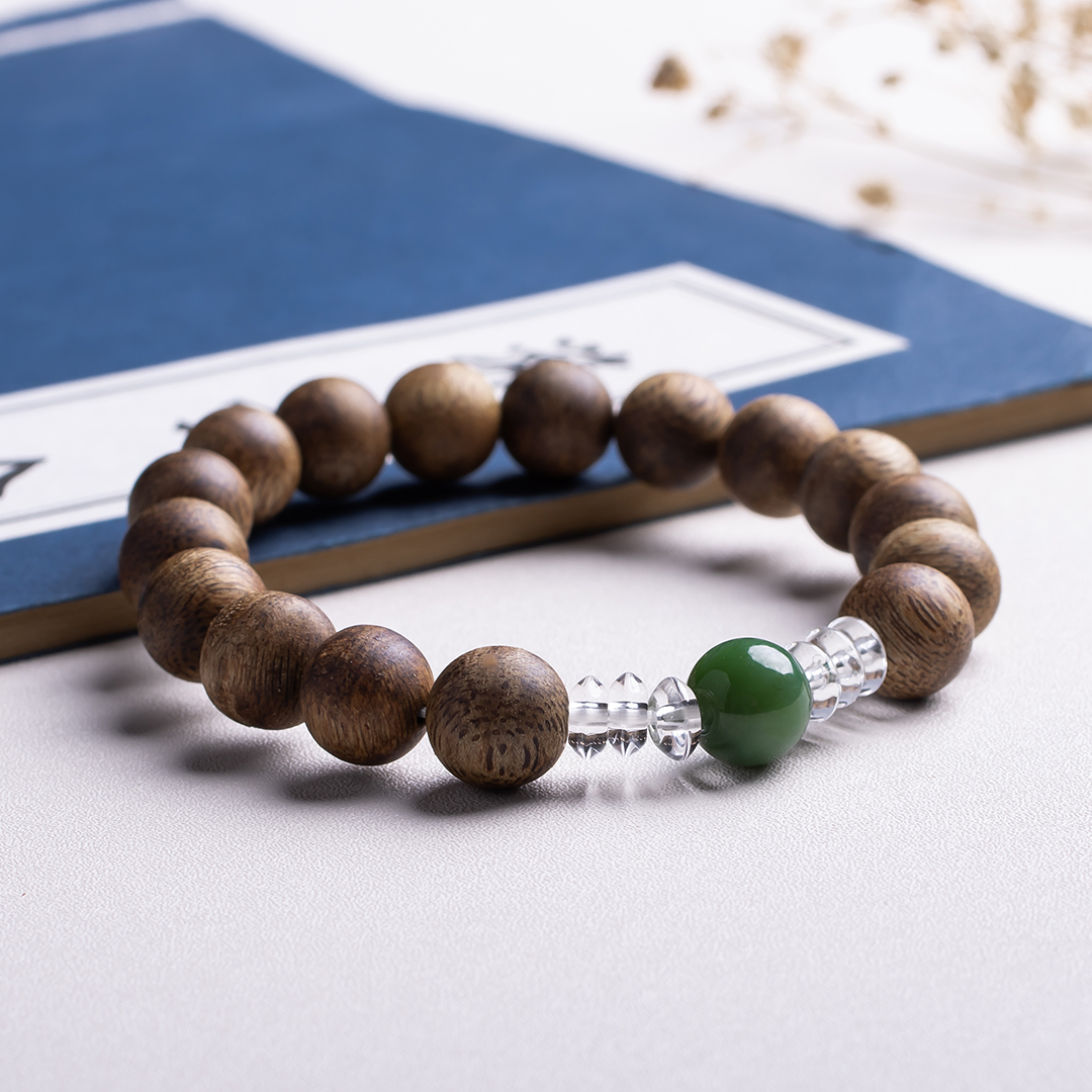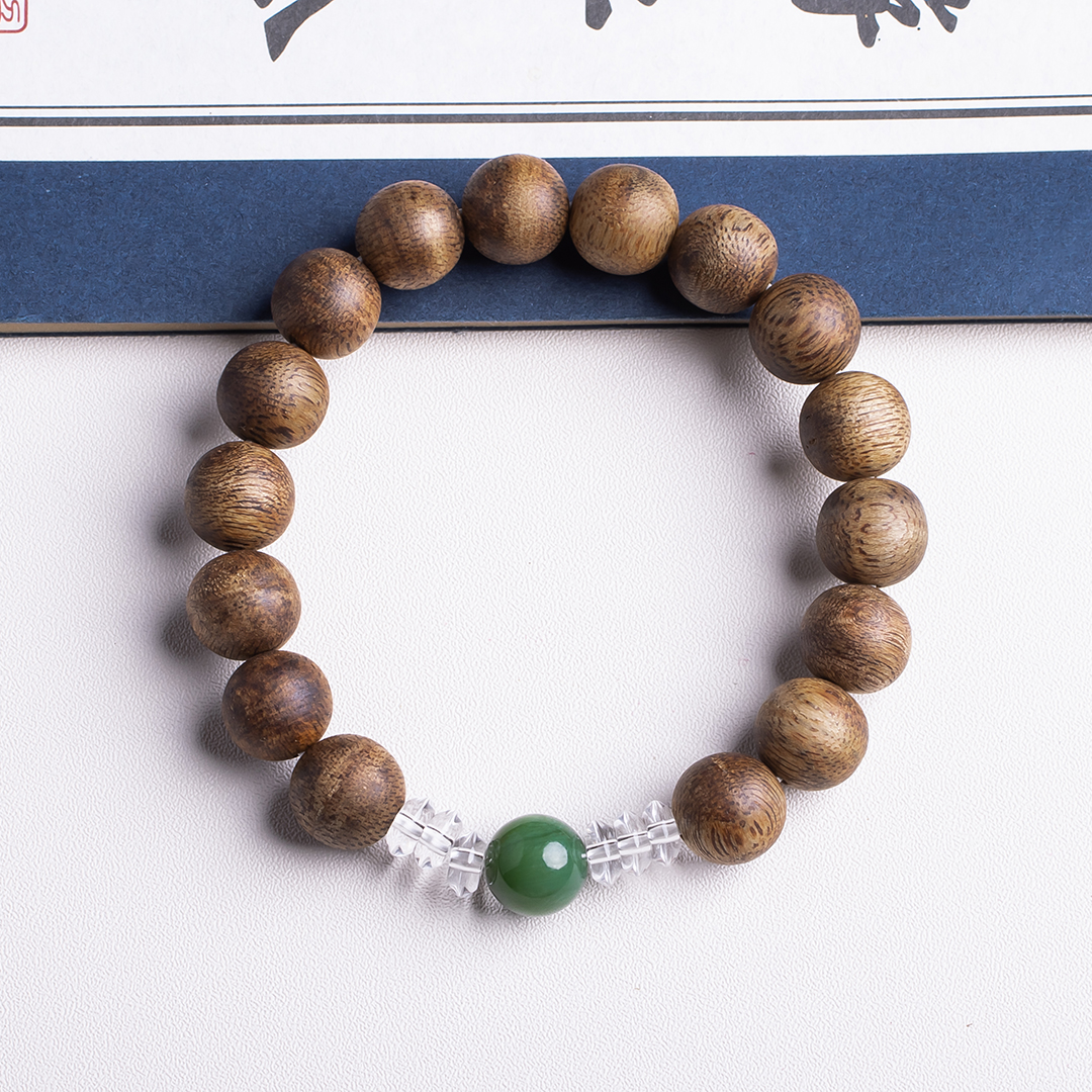 xy0389沉香+碧玉水晶手串,天然沉香约10.3mm,原色原味,香味自然清甜,一颗满色无黑点的碧玉,两边各三颗洁白纯净的白水晶,碧玉温润养身,水晶净化磁场,提供强大正能量。款式典雅大方。