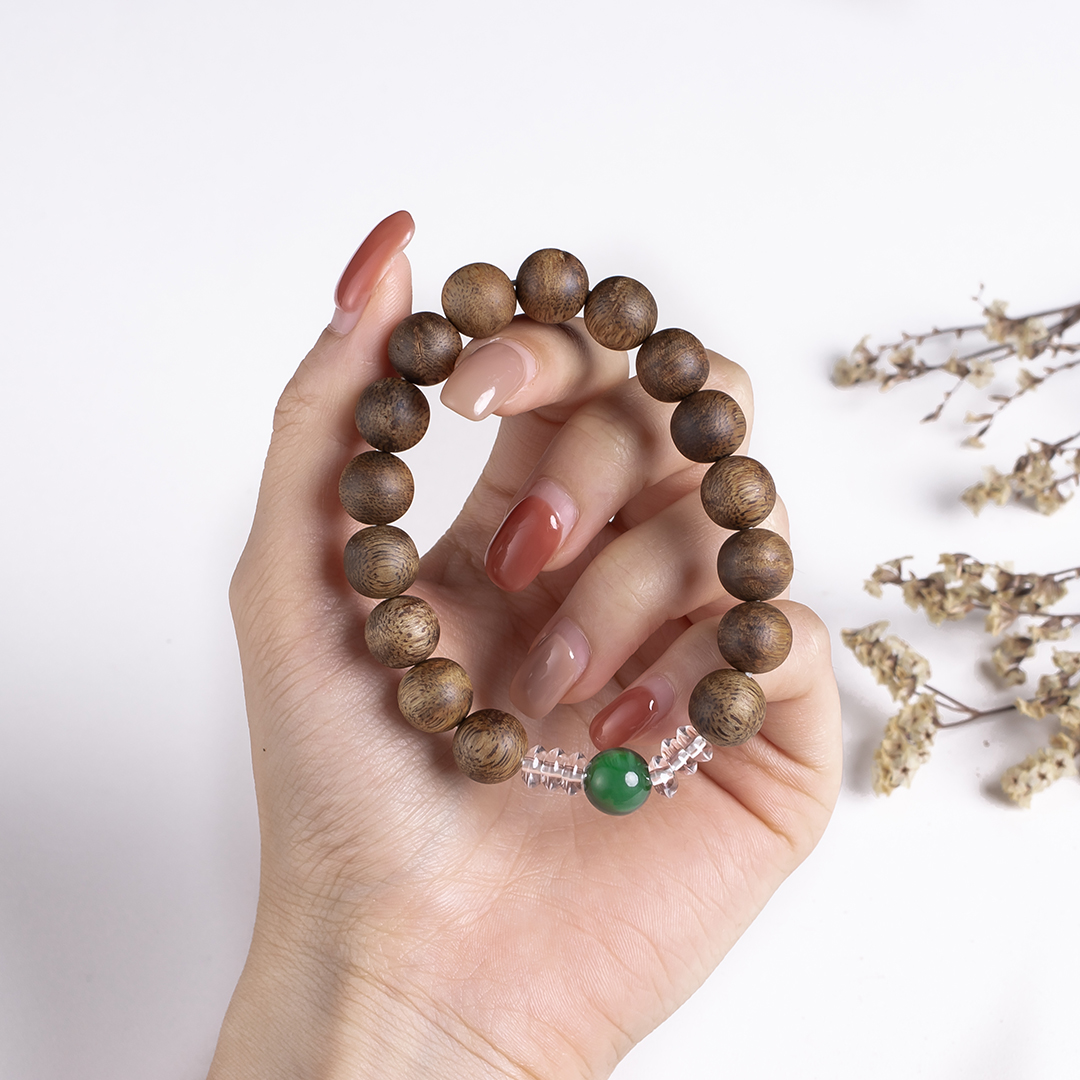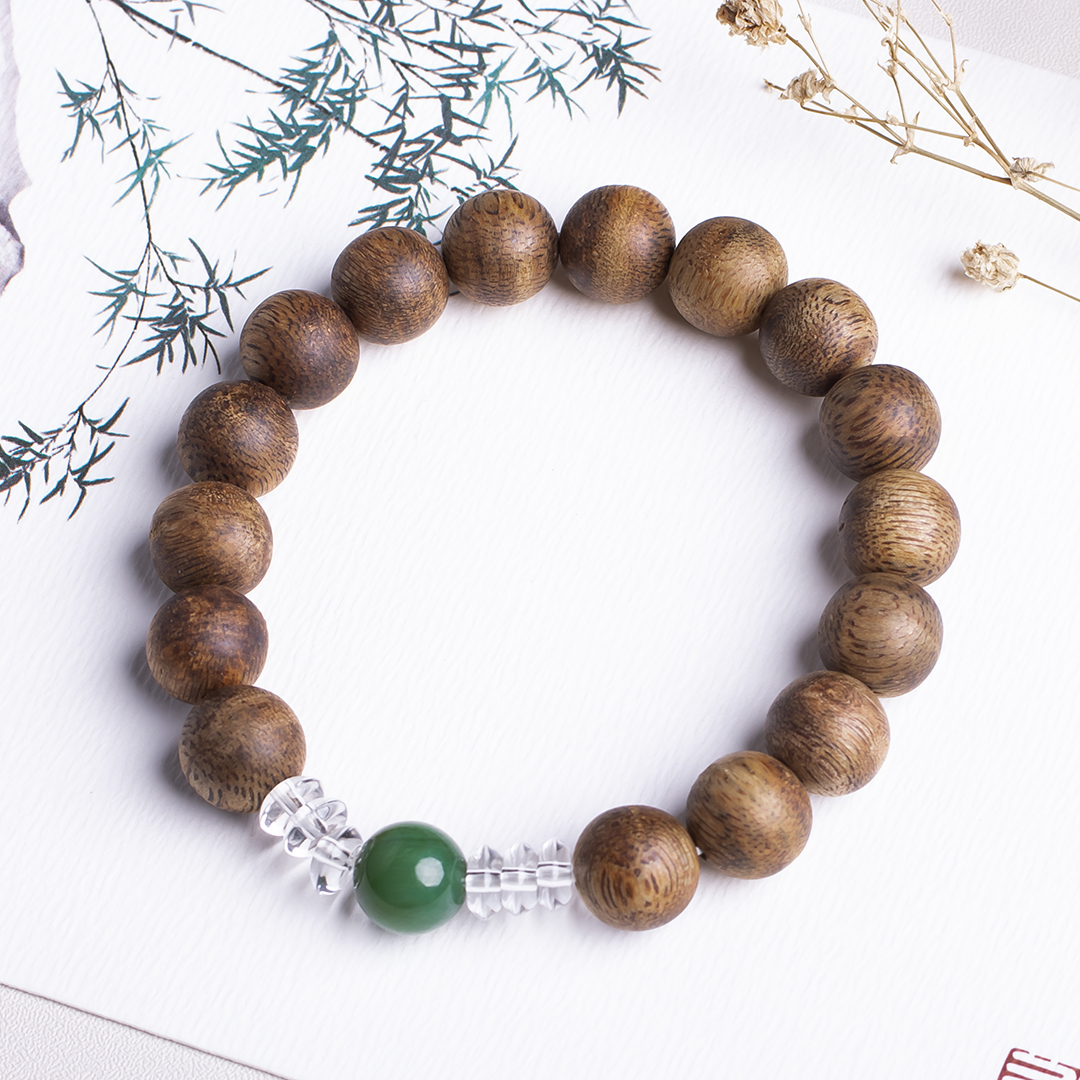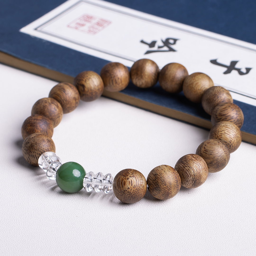 xy0389沉香+碧玉水晶手串,天然沉香约10.3mm,原色原味,香味自然清甜,一颗满色无黑点的碧玉,两边各三颗洁白纯净的白水晶,碧玉温润养身,水晶净化磁场,提供强大正能量。款式典雅大方。