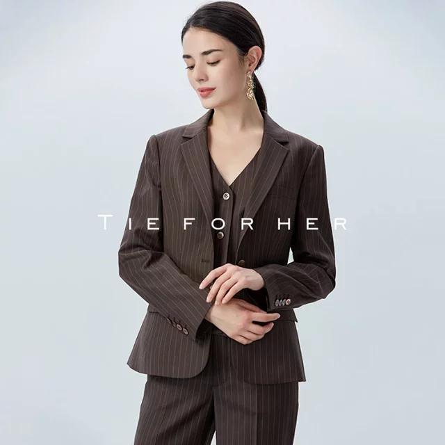 19LUX01咖啡色单排一粒扣条纹西服外套女西装套装女士马甲阔腿裤气质女装三件套