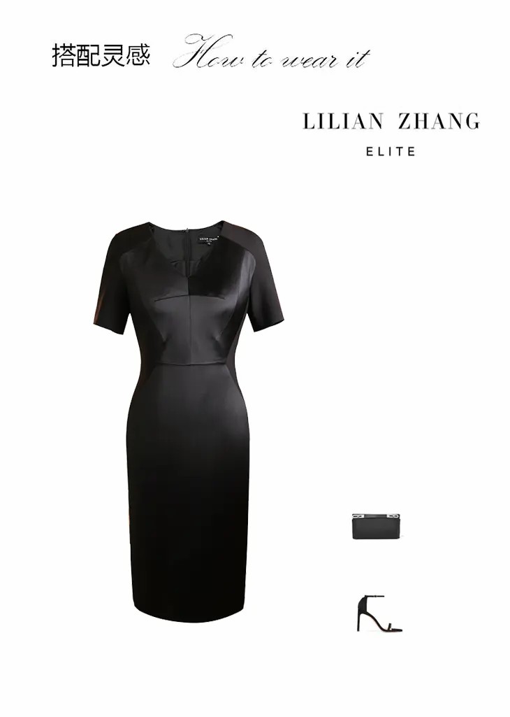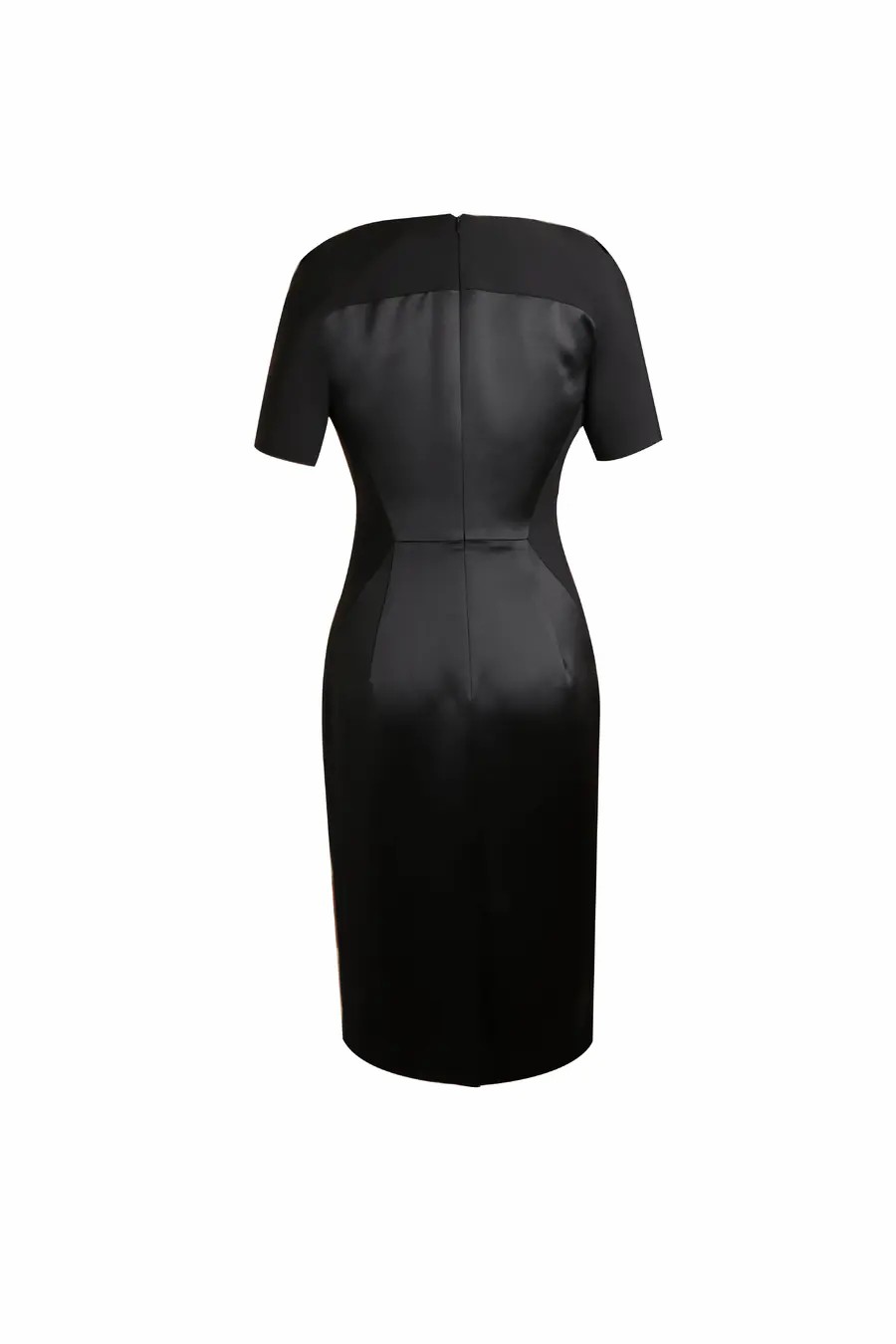 缎面拼接设计中短袖连衣裙、黑色礼服气质宴会修身名媛 1801052