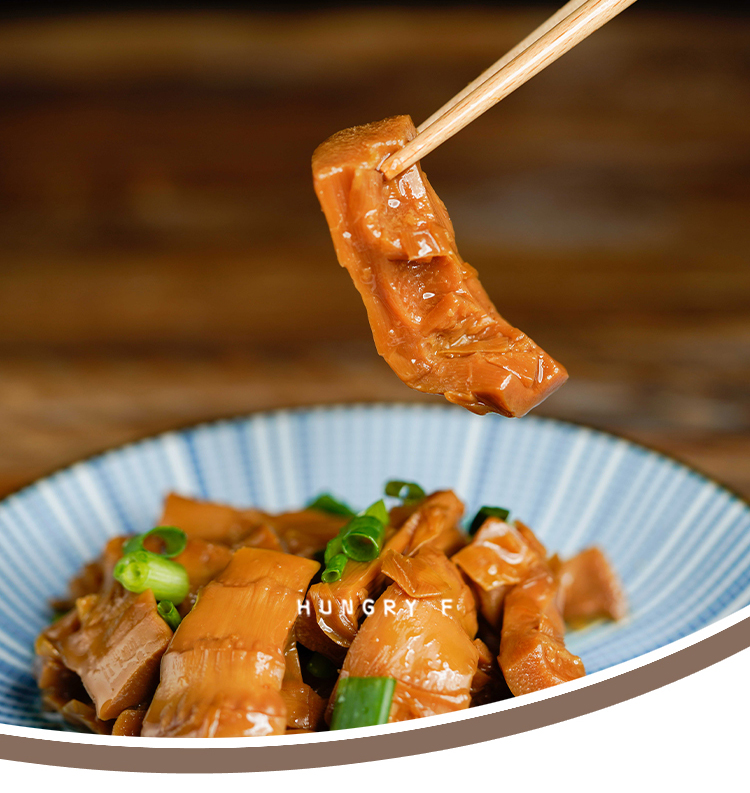 这是来自“中国雷笋之乡”奉化溪口的油焖笋,很地道的江南风味。跟之前店里上过的大董和临安笋不同,这款是以新鲜雷笋为食材的,通过无水慢烤、古法秘制,从人工挖笋、手工洗净、掐头去尾、无水慢烤、反复翻炒等十几道工序,脆嫩鲜甜的油焖笋才得以诞生。在整个烤制过程中以油当水,通过秘制酱汁烤制8-10小时,让笋咸鲜脆嫩,营养丰富,成为一道老少皆宜的小菜。