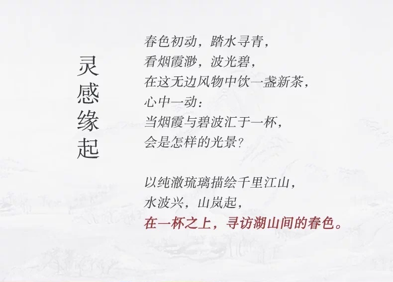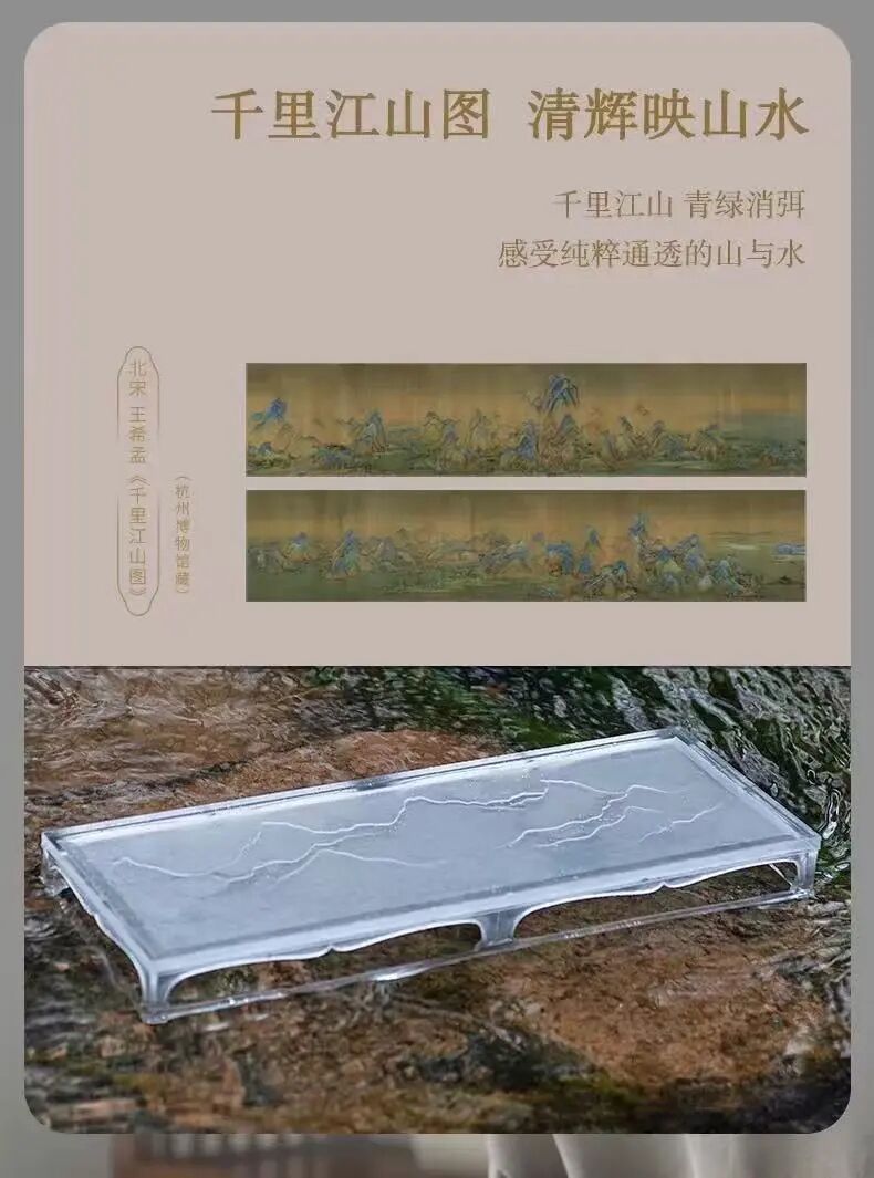 以千里江山的山水脉络为蓝本,用立体浅浮雕刻画于杯身与茶盘之上