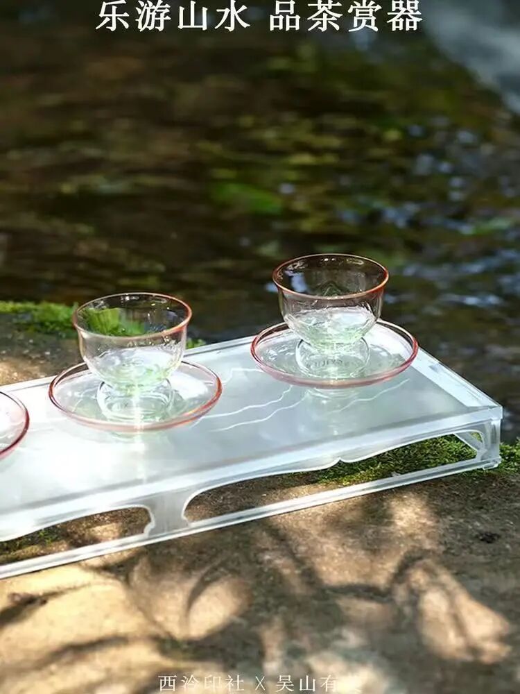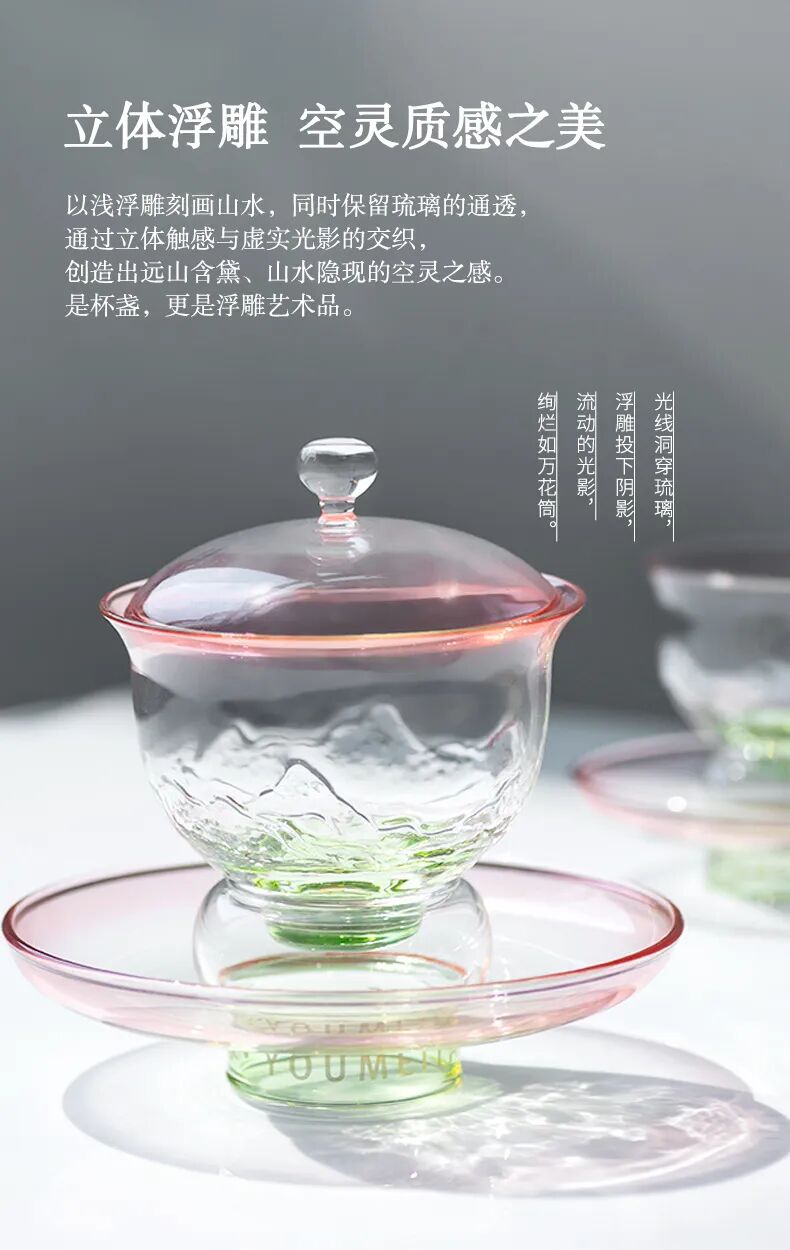 西泠有美堂·湖山雅集琉璃茶器套组 , 手工吹制的通透琉璃,杯身精致山水纹