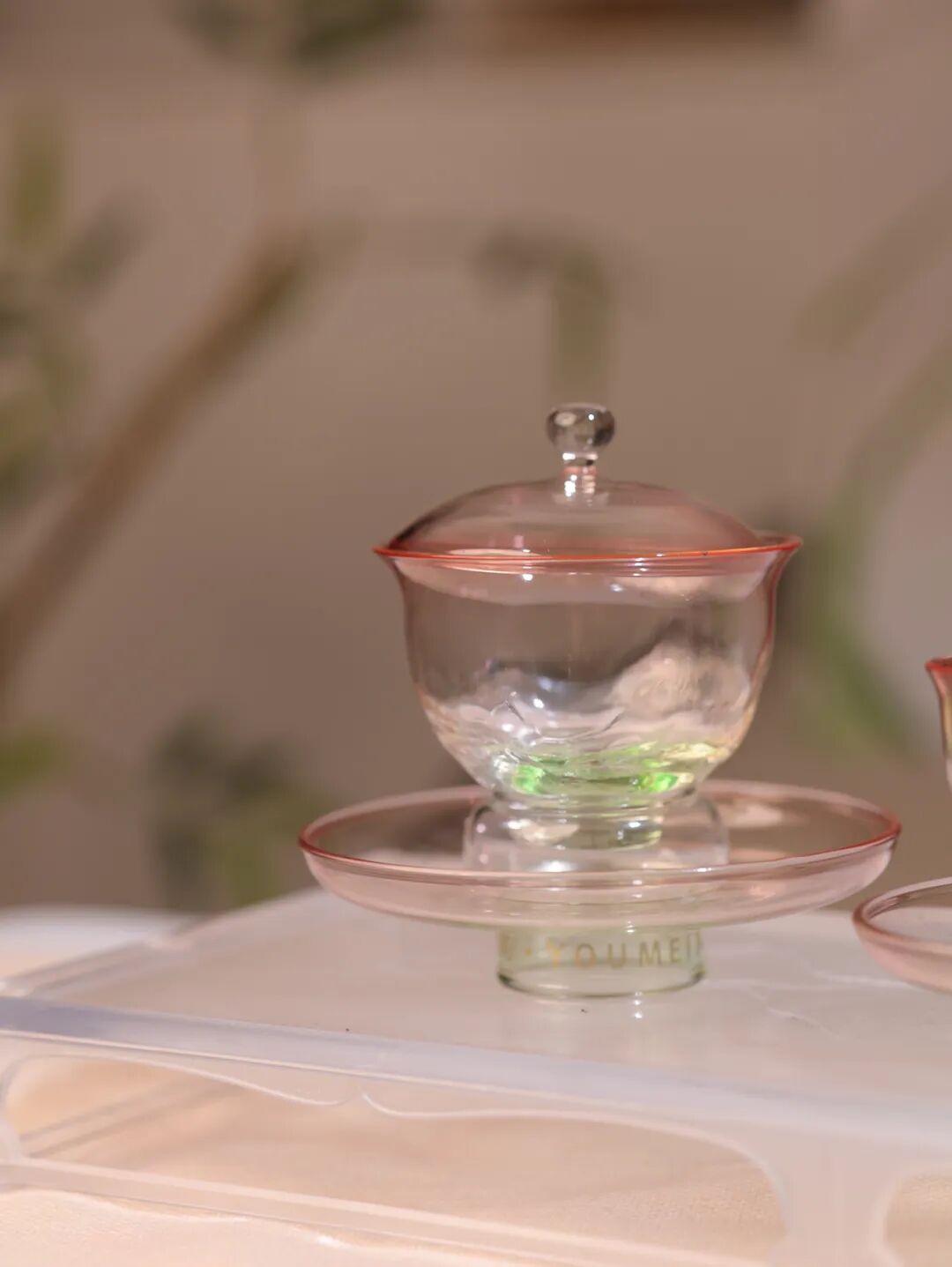 杯身青绿山水晕染,茶盘通透似留白
