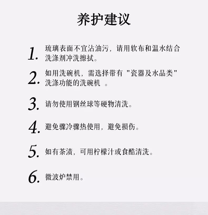 3、纯金贴花部位请勿用尖锐物品刮擦,避免脱落,影响美观