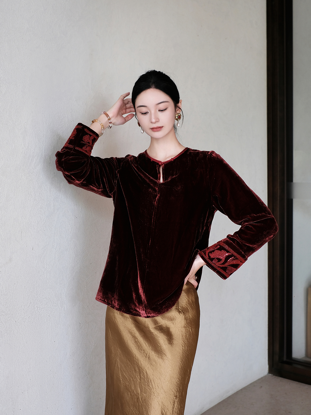下架|盛唐婧| 新中式圆领重工钉珠百搭上衣-红色