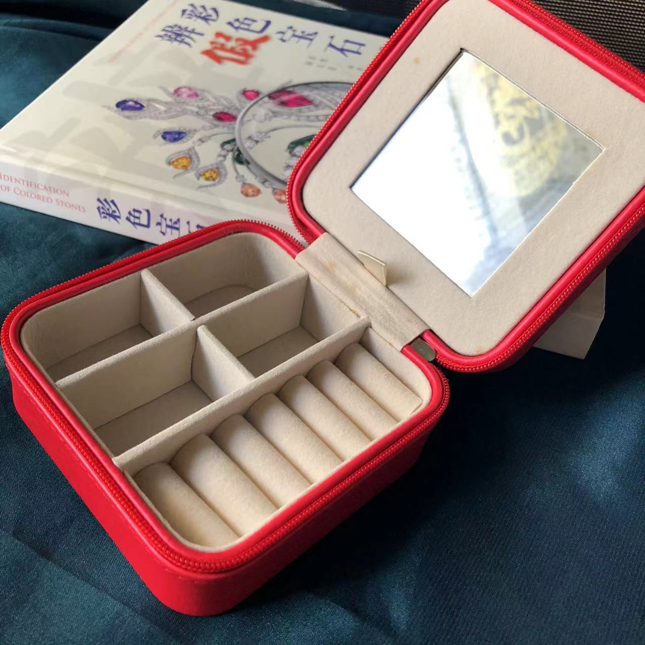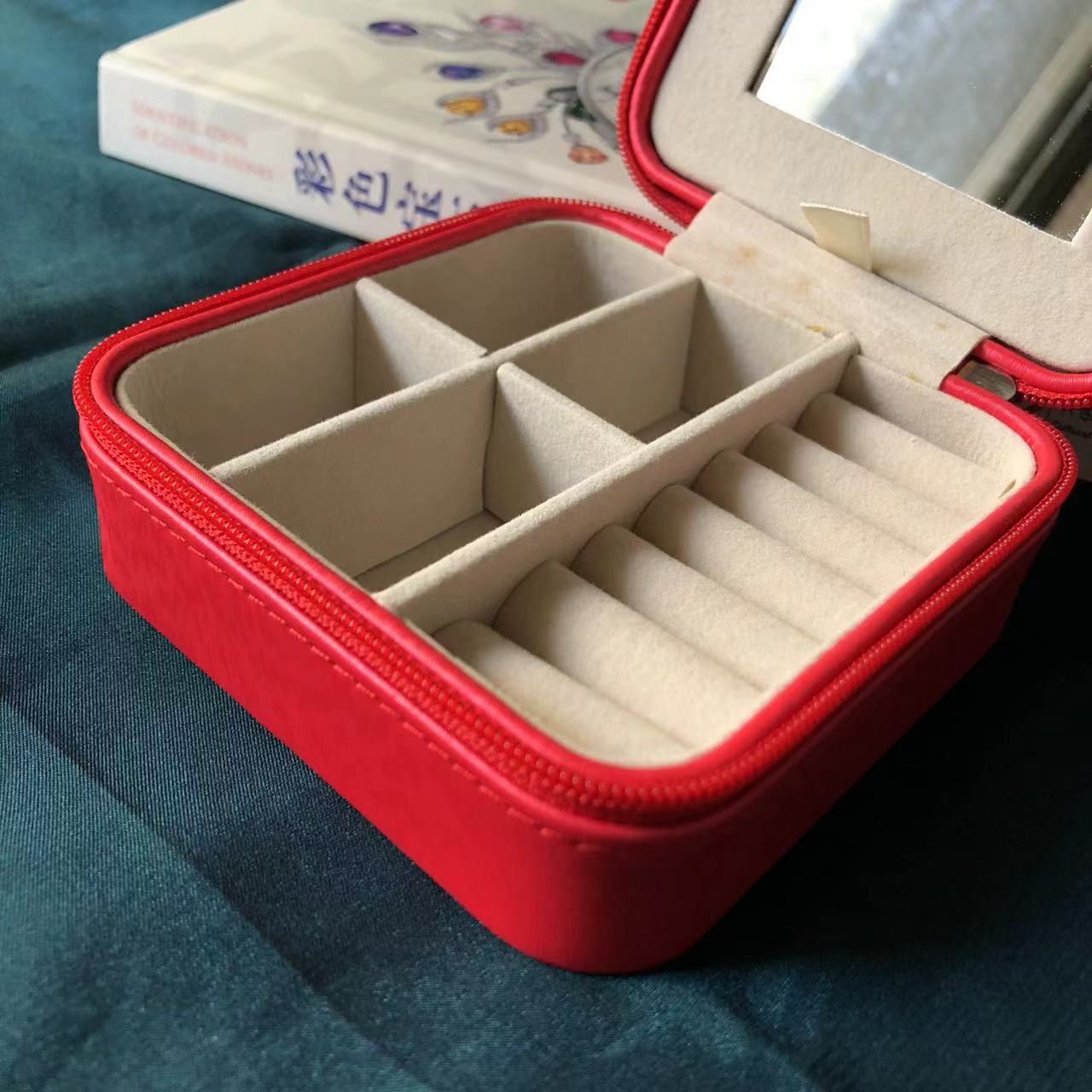 红色珠宝收纳盒,PU皮,内衬绒面,拉链闭合,内带化妆镜。