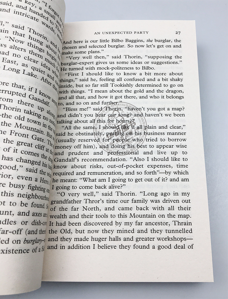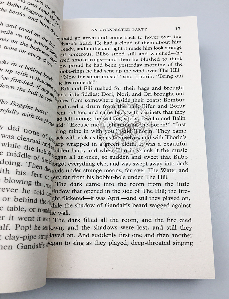 In a hole in the ground there lived a hobbit. Not a nasty, dirty, wet hole, filled with the ends of worms and an oozy smell, nor yet a dry, bare, sandy hole with nothing in it to sit down on or to eat: it was a hobbit-hole, and that means comfort. It had a perfectly round door like a porthole, painted green, with a shiny yellow brass knob in the exact middle. The door opened on to a tube-shaped hall like a tunnel: a very comfortable tunnel without smoke, with panelled walls, and floors tiled and carpeted, provided with polished chairs, and lots and lots of pegs for hats and coats—the hobbit was fond of visitors. The tunnel wound on and on, going fairly but not quite straight into the side of the hill—The Hill, as all the people for many miles round called it—and many little round doors opened out of it, first on one side and then on another. No going upstairs for the hobbit: bedrooms, bathrooms, cellars, pantries (lots of these), wardrobes (he had whole rooms devoted to clothes), kitchens, dining-rooms, all were on the same floor, and indeed on the same passage. The best rooms were all on the left-hand side (going in), for these were the only ones to have windows, deep-set round windows looking over his garden and meadows beyond, sloping down to the river. This hobbit was a very well-to-do hobbit, and his name was Baggins. The Bagginses had lived in the neighbourhood of The Hill for time out of mind, and people considered them very respectable, not only because most of them were very rich, but also because they never had any adventures or did anything unexpected: you could tell what a Baggins would say on any question without the bother of asking him. This is a story of how a Baggins had an adventure, found himself doing and saying things altogether unexpected. He may have lost the neighbours’ respect, but he gained-well, you will see whether he gained anything in the end.