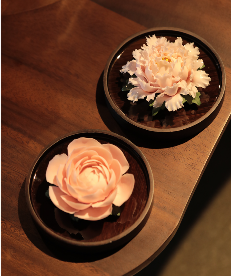 牡丹,花中的芳华馥郁,常有吉祥如意的寄语。用羊脂玉瓷泥,双手做成这一朵牡丹花,栩栩如生,永不凋零。