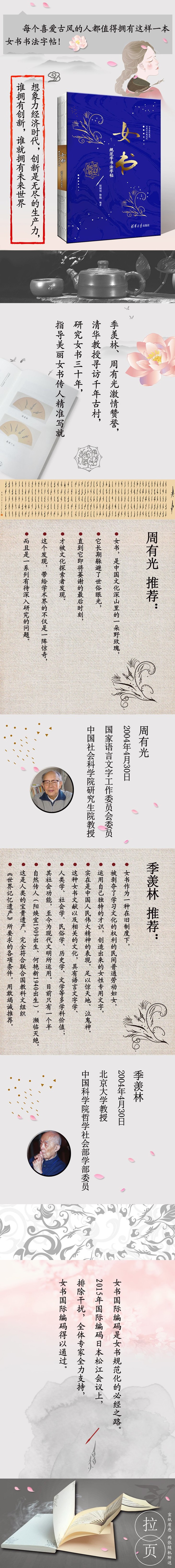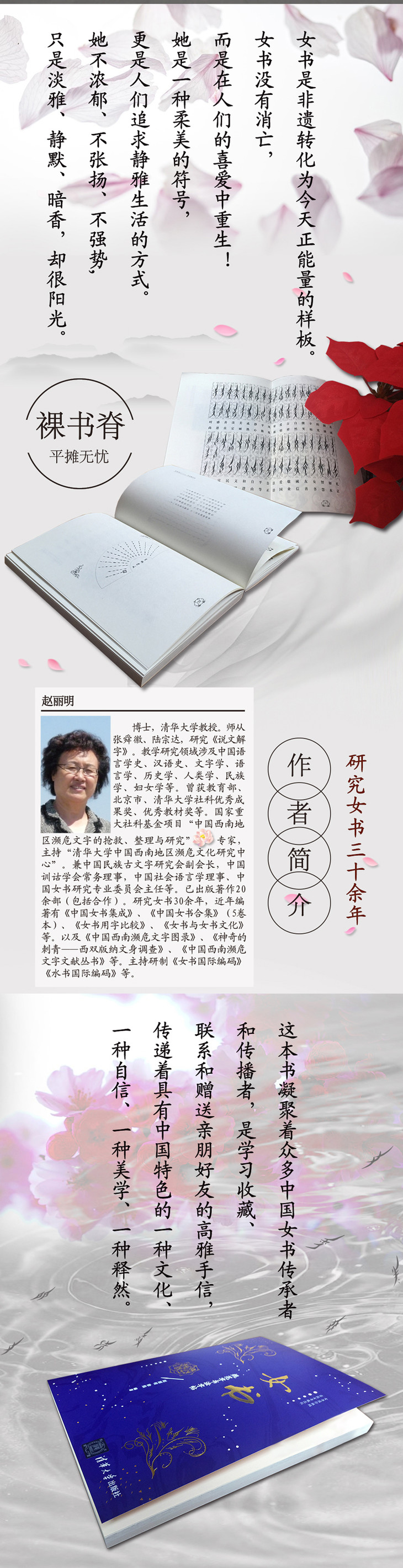 《女书规范字书法字帖》 有一种字,周有光先生称之为“深山里的野玫瑰”。季羡林评之为“用敢竭诚推荐”。 这便是女书。这野玫瑰带着南岭的清芬和潇水的温情,仆仆而来,愿君采撷,接受这份爱与美的馈赠。 女书是神奇的,它是目前世界仅有的一种女性文字,完全由女性创作并使用,代表着别样的文化生态。 女书又是日常的。它曾是江永女人日常书写的文字,咏唱的歌谣,母女之情、姐妹之谊在此间蔓延,如花儿一般悄然绽放。 但女书同样是需要传承的。那么,何为依据?何谓标准?女书那样清纯,那样乡情。不是谁随意规定的,自封的。 国际编码是女书规范化的必经之路。女书研究专家,清华大学教授赵丽明30年倾力写就,力求通过以女书的逝者遗文22万字为素材穷尽性统计女书文字,再现女书文化传奇。 写着写着,你也成了女书书法家! |