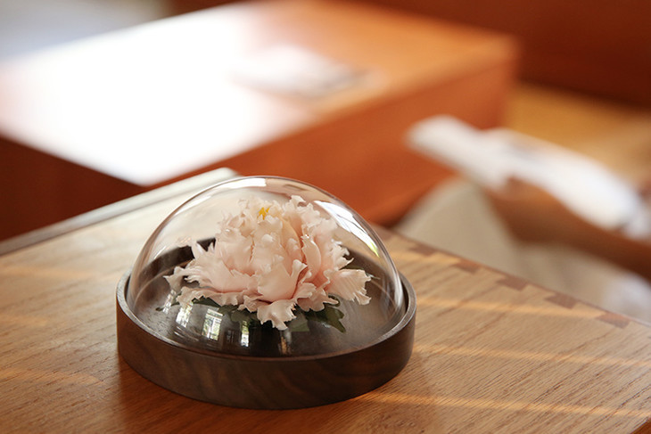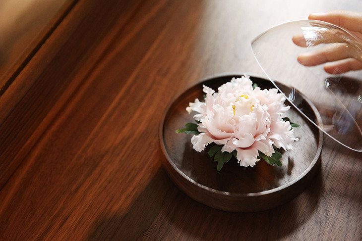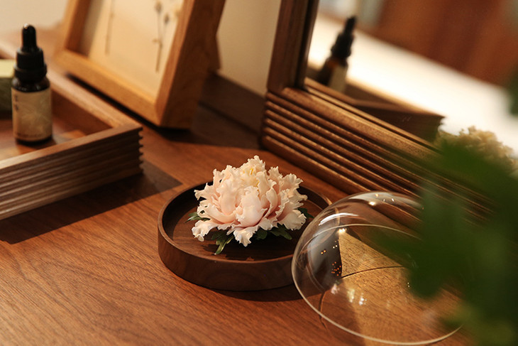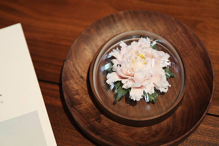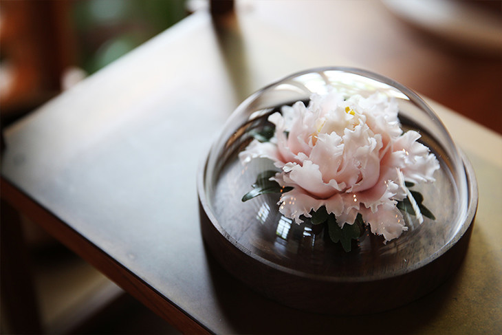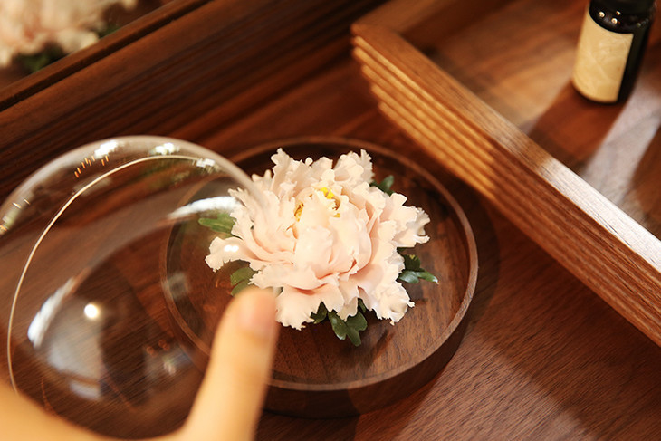「器渡文房」团队,便特地设计了半球形的亚克力罩,并且将牡丹固定在木质托盘上,保护好这朵永盛之花。