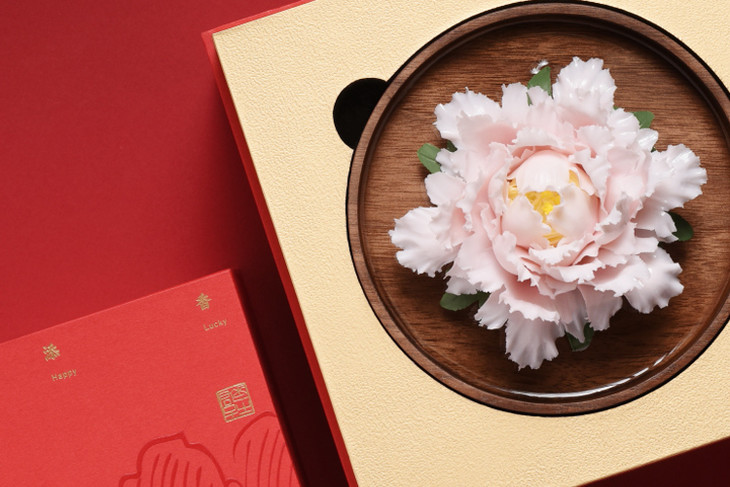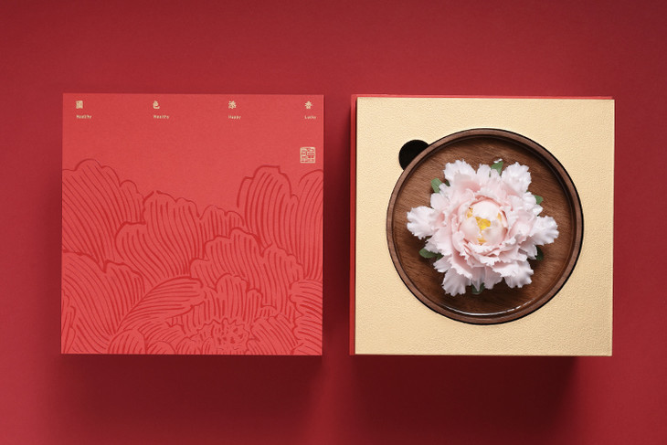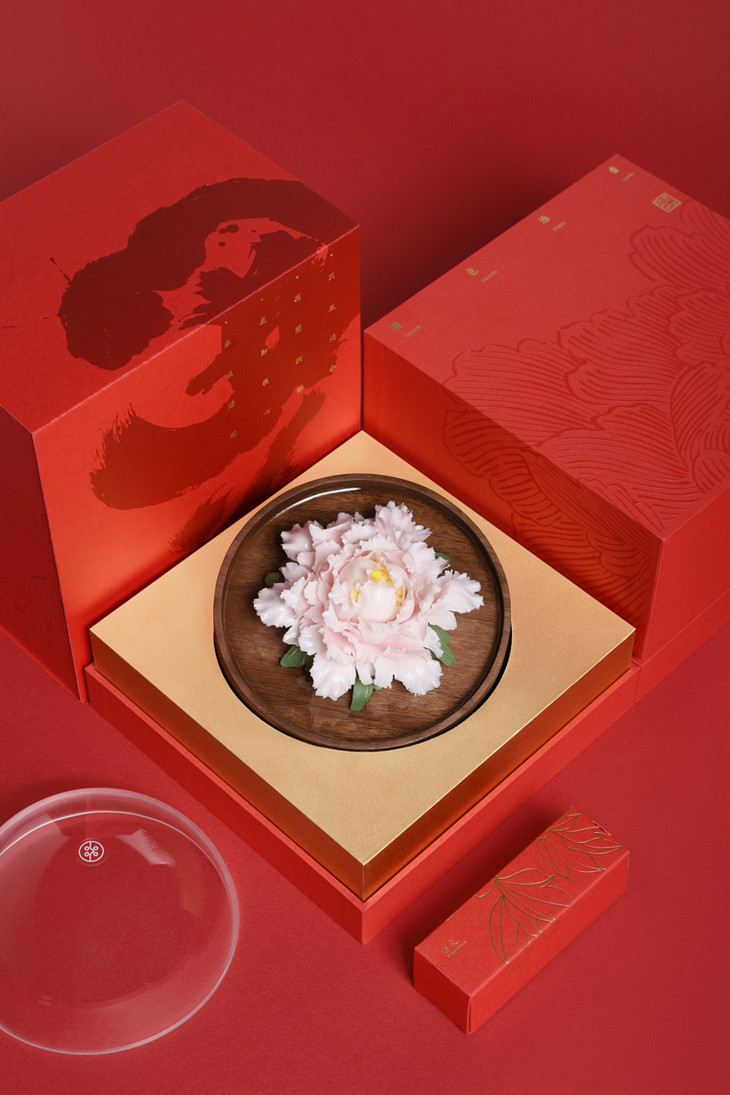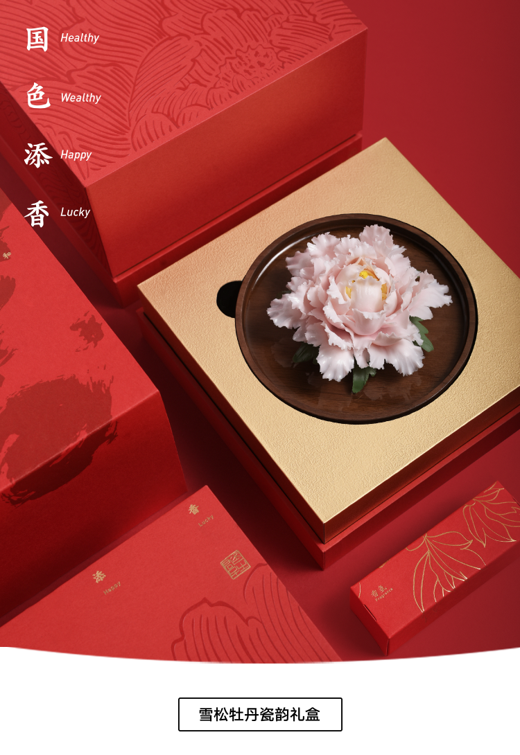 中国红的雅致礼盒上,浮印着牡丹花瓣,透着富贵吉利,赠予亲朋好友时,也更加体面有品味。