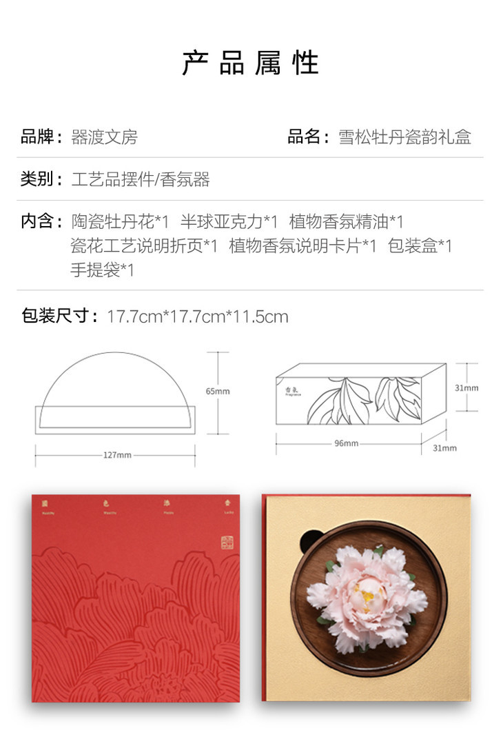 因此,以手捏瓷花工艺,做成这香氛礼盒——那瓷牡丹,以绽放之姿,开得恰到好处,仿若随风荡漾,栩栩如生,竟还能像真花一般散发芬芳,连永生花也难以企及。
