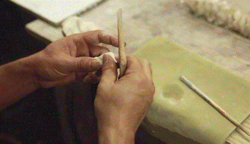 粗糙长茧的手指,灵活而巧妙地轻压、稳抹、细琢纹理……