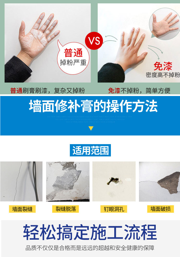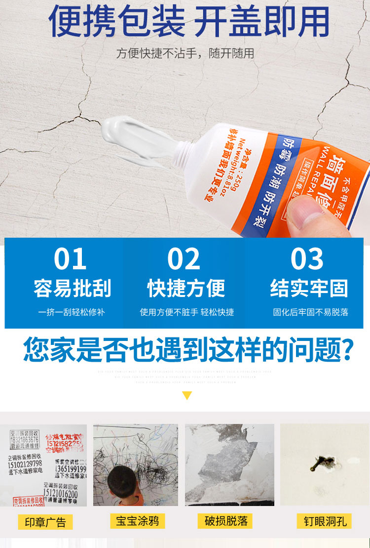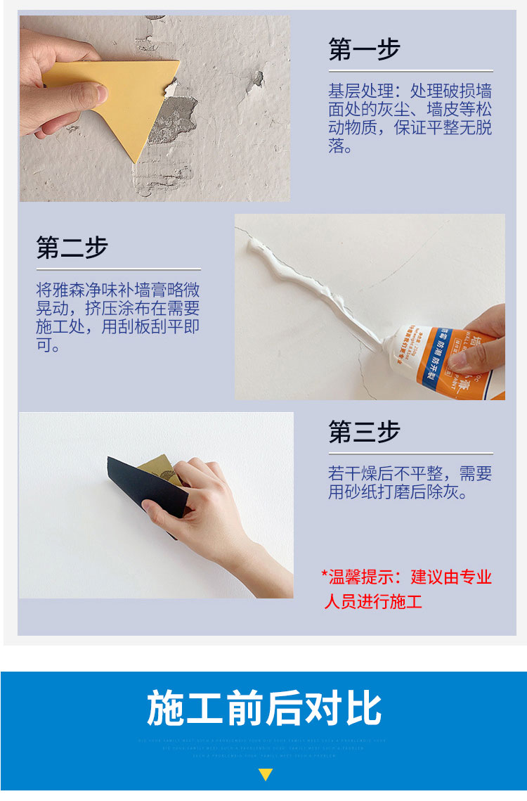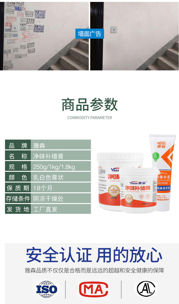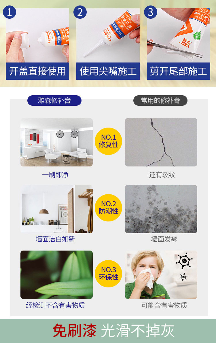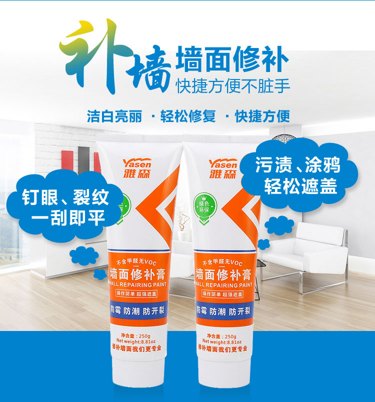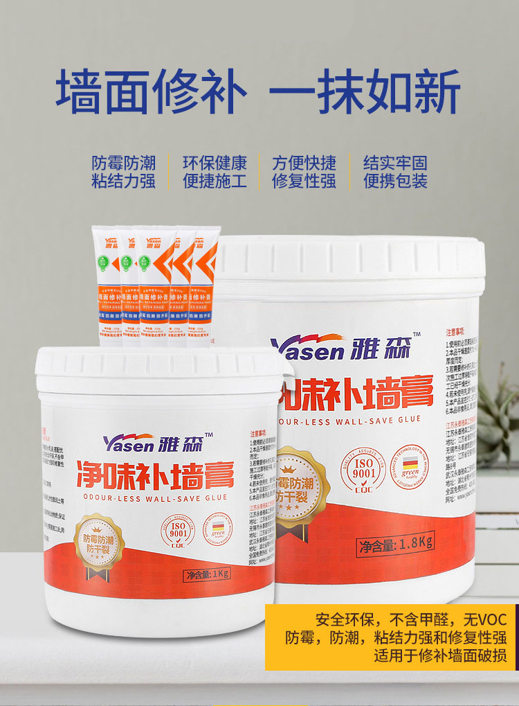 雅森环保净味补墙膏涂料3kg 防水防潮防霉防干燥墙面修补墙壁翻新墙体开裂