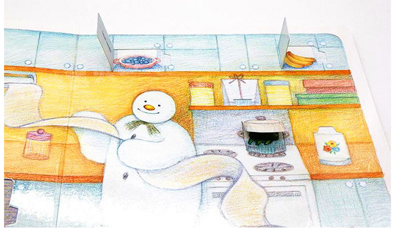 作者雷蒙・布力格说常常有人问他画《雪人》时是用了一种什么样的技法,他说他没有用普通的钢笔或铅笔勾线条,也没有用任何墨水或水彩涂色。它全部是用彩色铅笔(pencil crayons)画出来的——它的笔触温暖朴实,特别是那种柔和的暖色调,与这个冬夜里发生的梦幻般的故事吻合极了。