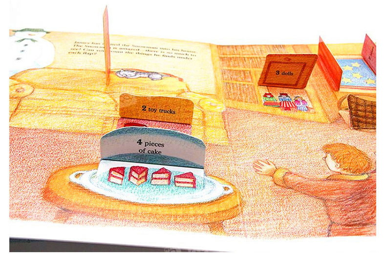 雪人完成了,James邀请雪人进屋参观,雪人发现了好多有趣的东西,快来数一数纸盖下面有几种物品吧!