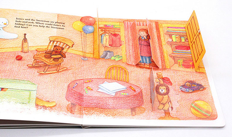 James堆了一个大雪人,快来帮雪人找一个帽子、一条围巾、一个橘子(当做鼻子)和一些煤块(当做眼睛和纽扣)吧。木材堆下面有什么?草丛里有什么?门后面有什么?栅栏后面有什么?都来翻一翻吧!
