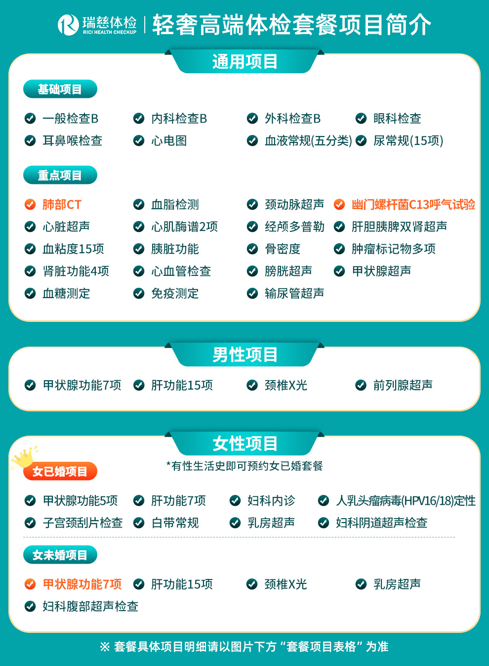| 都市压力人群体检的优选套餐,升级多项肿瘤标志物筛查,肺部CT,经颅多普勒检查等,为您的健康保驾护航。 | |||||