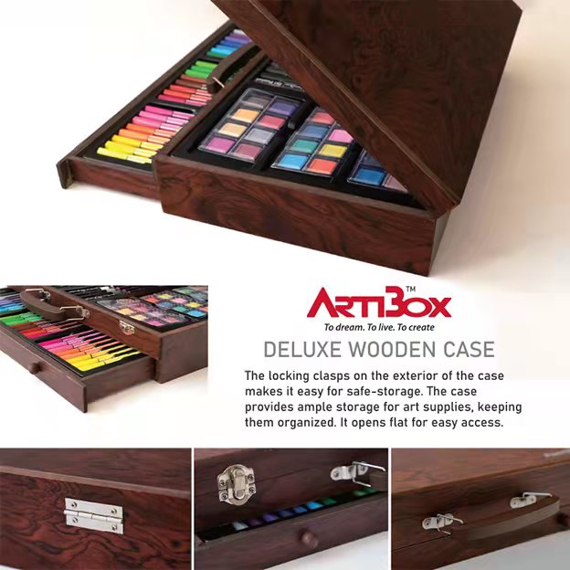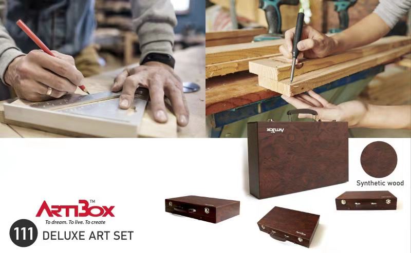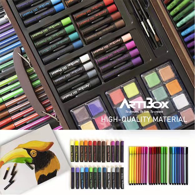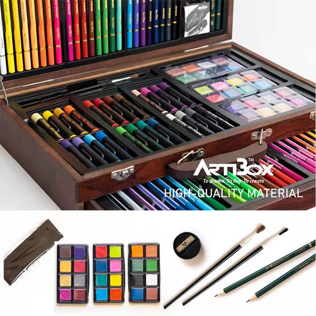 24色六角水彩笔、24色顺滑油画棒、12色彩铅(圆杆)、12色水彩块、2支素描铅笔、2支尼龙毛画笔、1片砂纸、1只铝质双孔卷笔器、1只可塑橡皮、1本线装页绘画纸、1本线装彩铅画专用纸