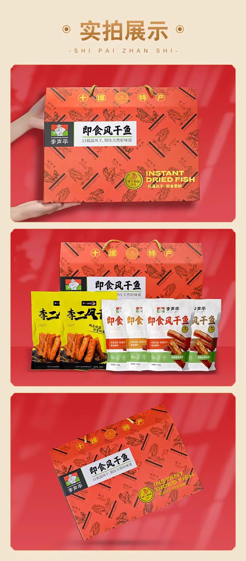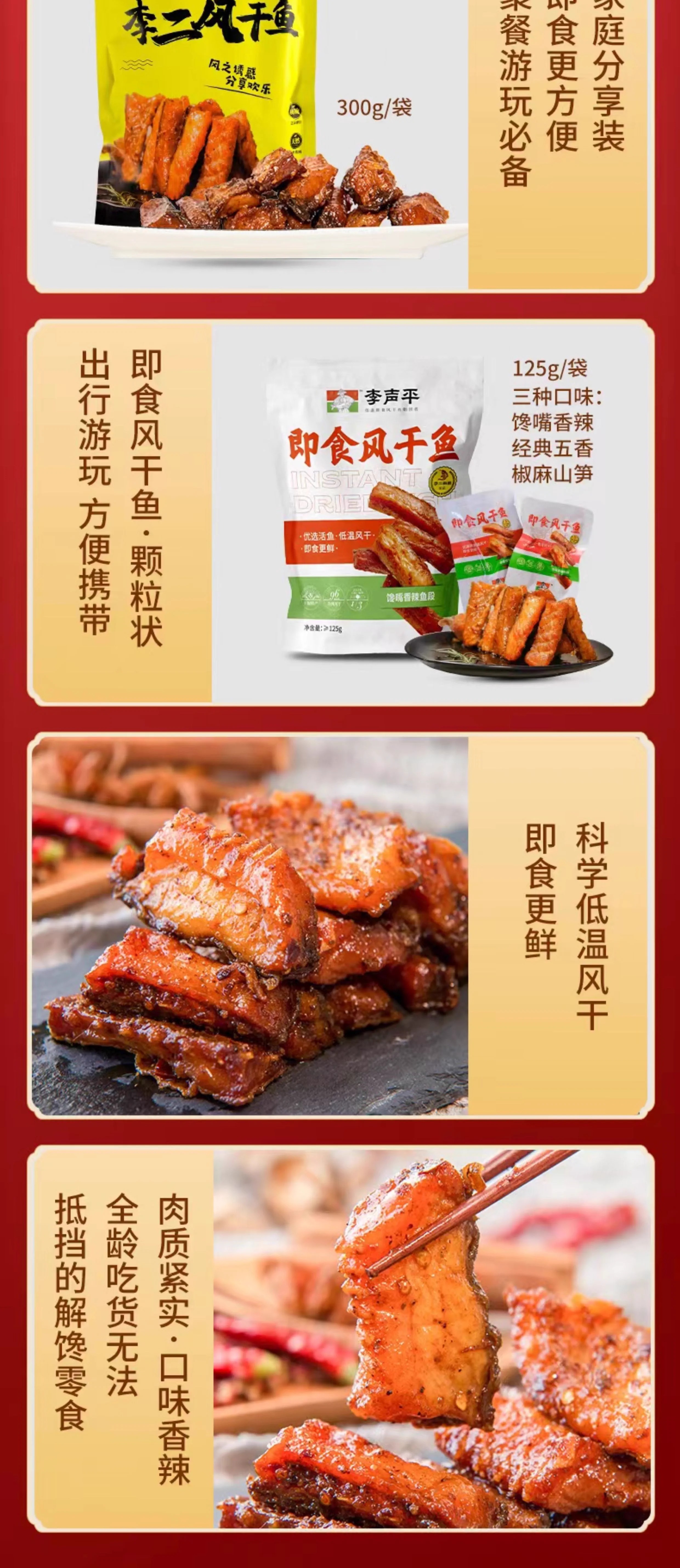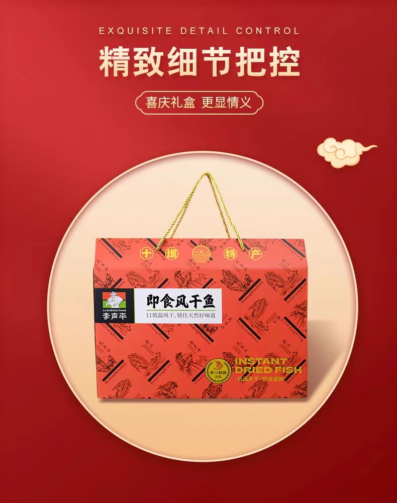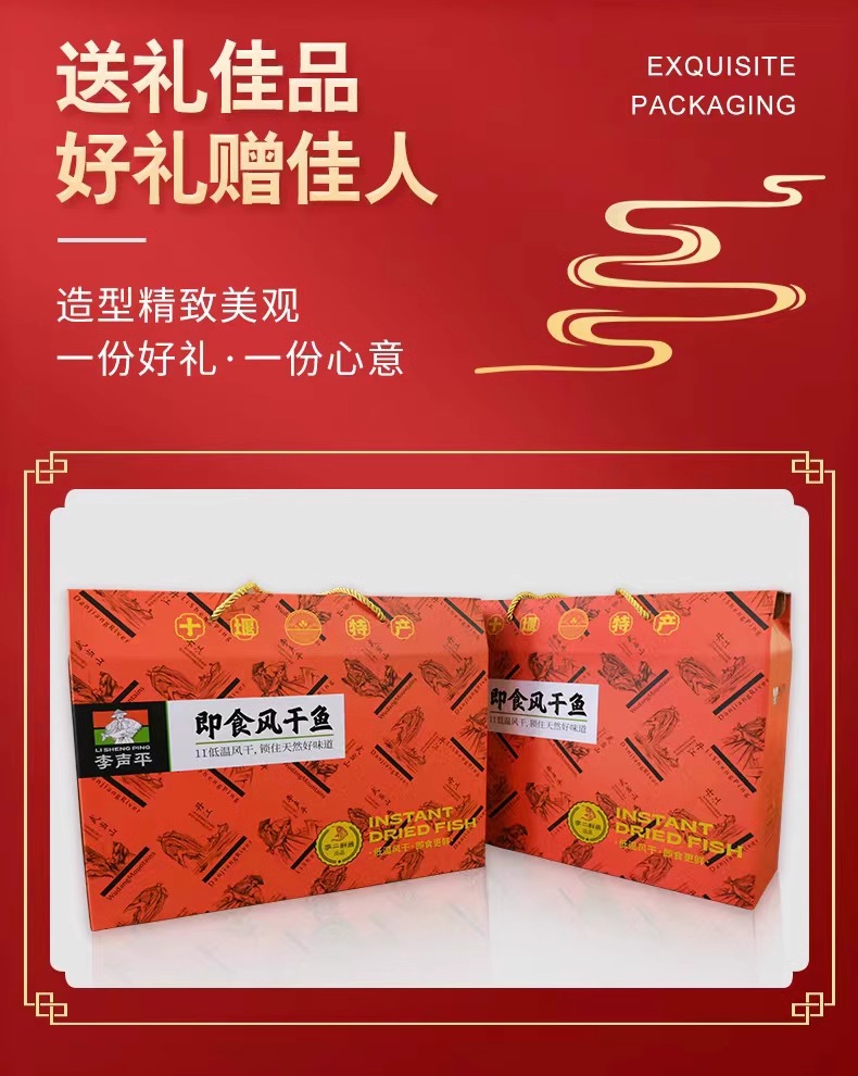 礼盒内含:风干鱼家庭装300gx2,即食风干鱼五香125gx2,即食风干鱼香辣125gx1,鲜辣鱼尾80gx2