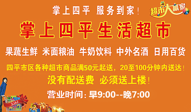掌上四平生活超市:四平市区各种超市商品满50元起送,20至100分钟内送达!没有配送费 必须送上楼!营业时间:早9:00至晚7:00,客服电话:0434—6077601