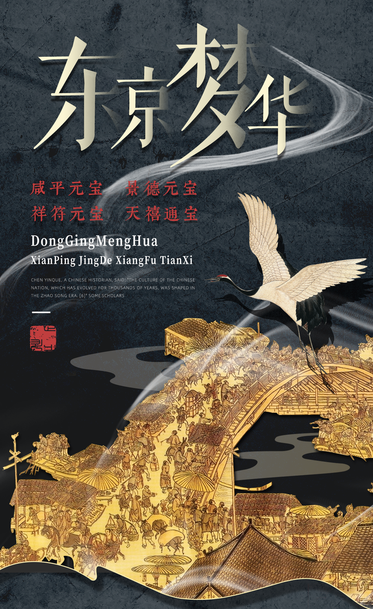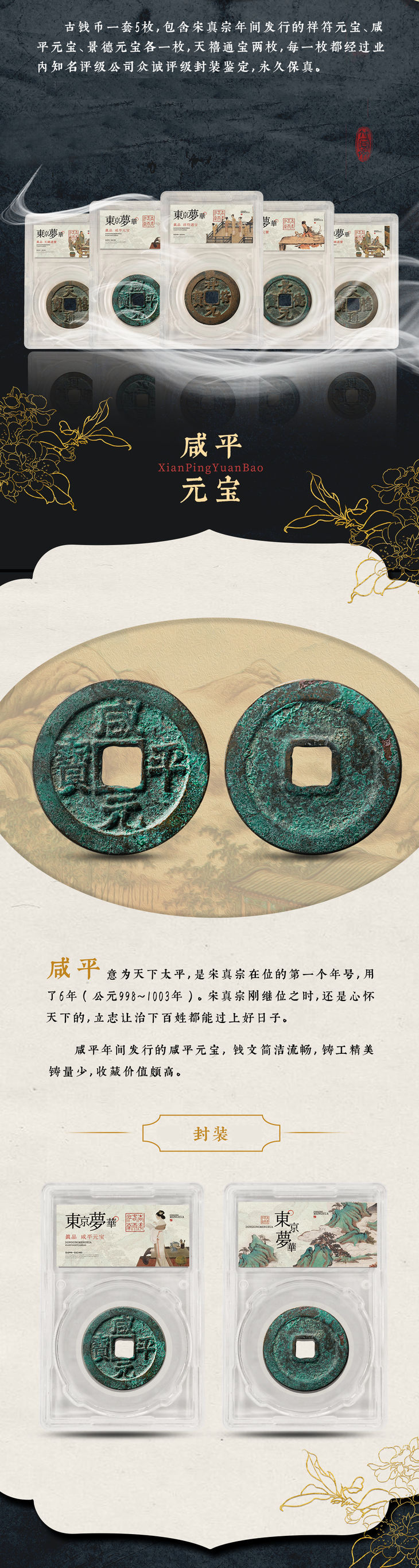 《东京梦华》北宋古钱币套装一套5枚,包含咸平元宝、景德元宝、祥符元宝各一枚,天禧通宝两枚。