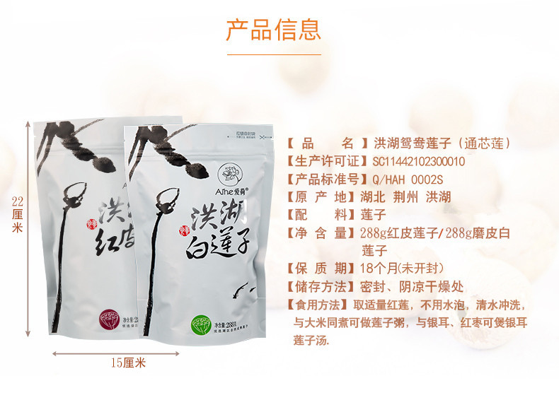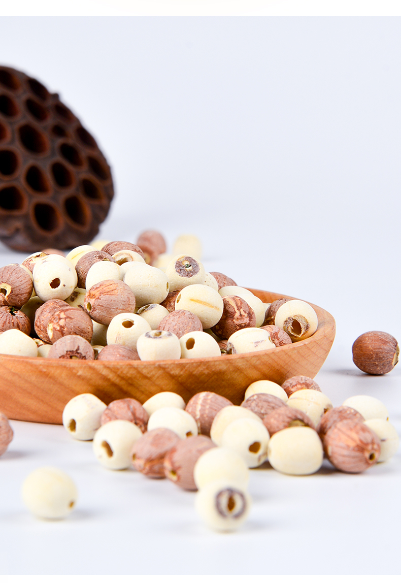 农场种植的是洪湖野生莲子品种,个头小但营养丰富,矿物质含量高。莲蓬日晒夜露自然成熟后,绿色外皮变的黑硬(俗称铁莲)牢牢把营养锁在里面不流失,机器去掉硬壳外皮和莲芯后露出红色内皮(红莲),所以红莲表面就会有凸凹不平的坑洞。这个红皮在“本草纲目”中是一味对身体有益的药材。