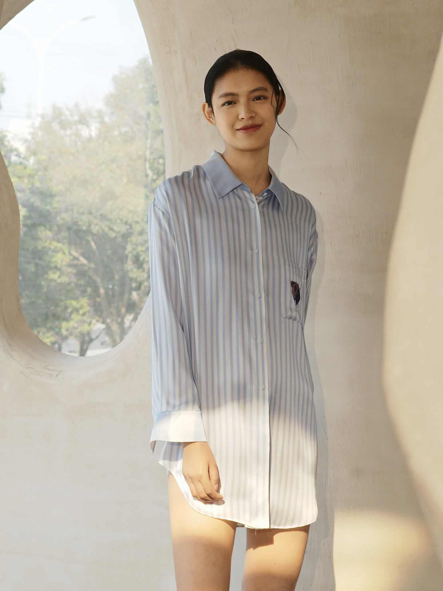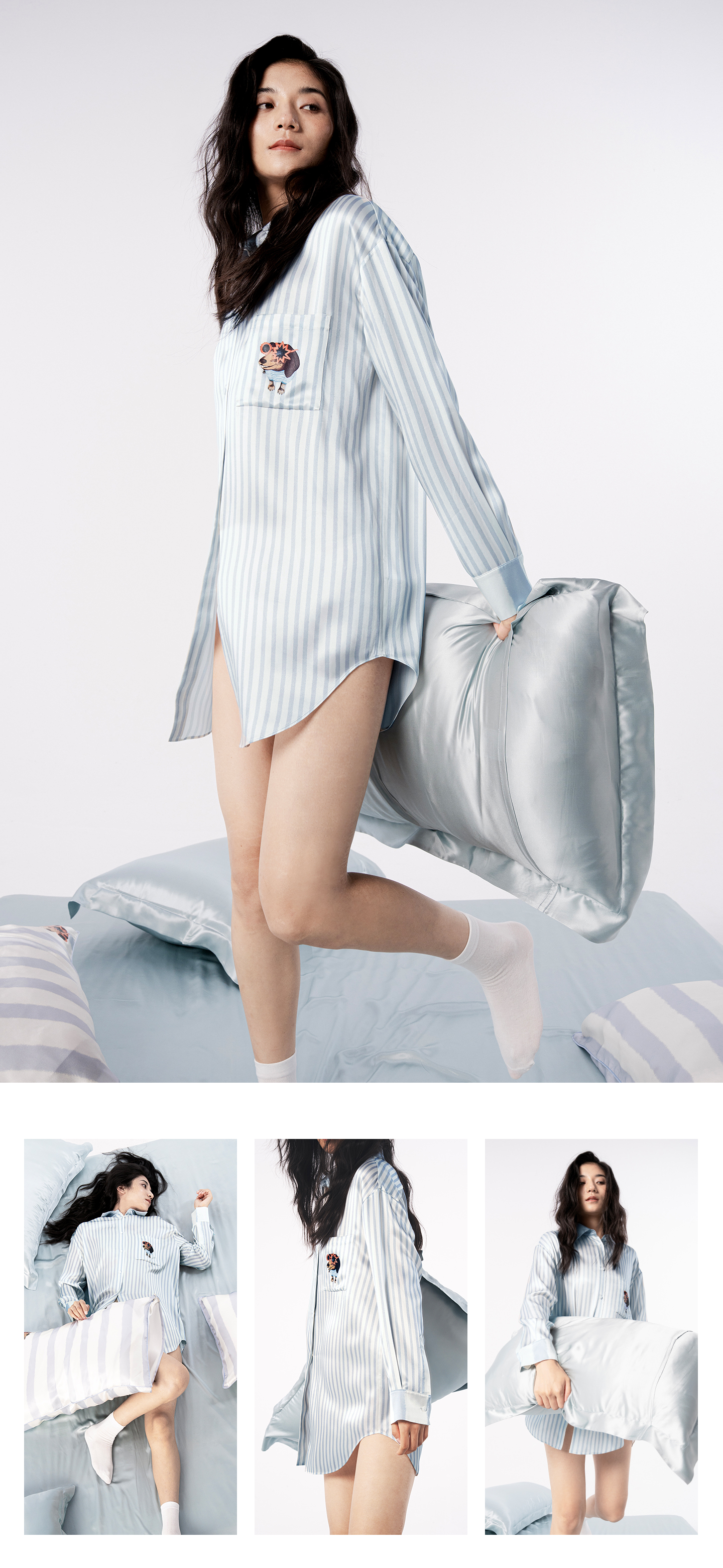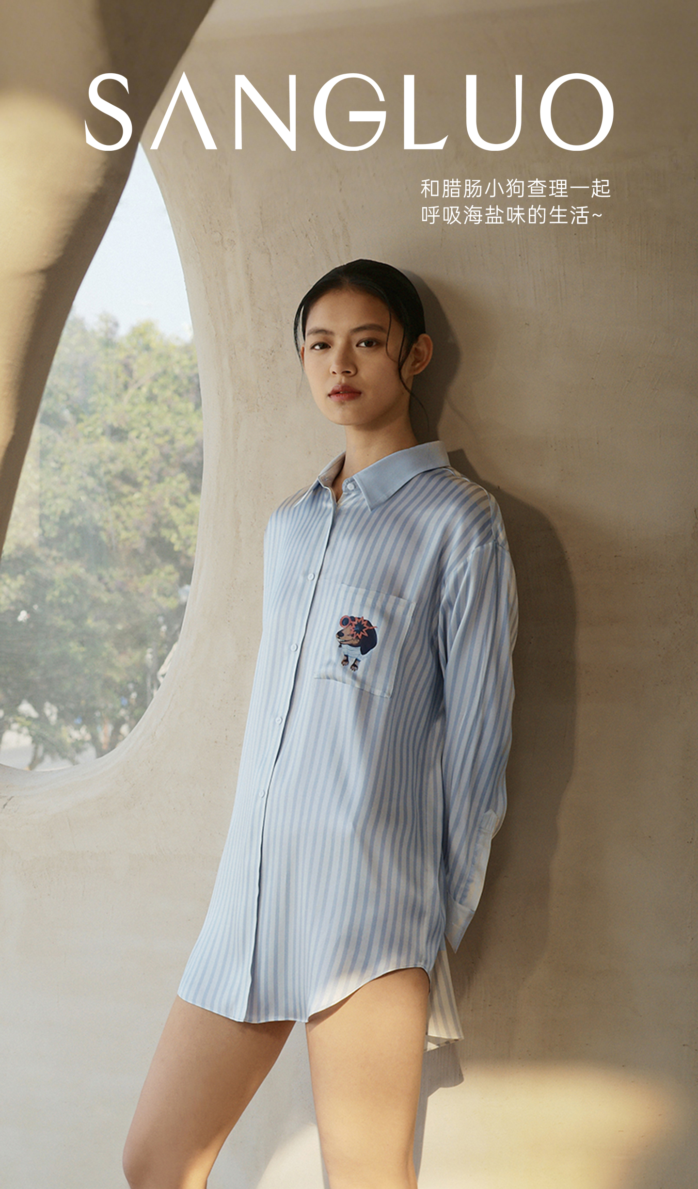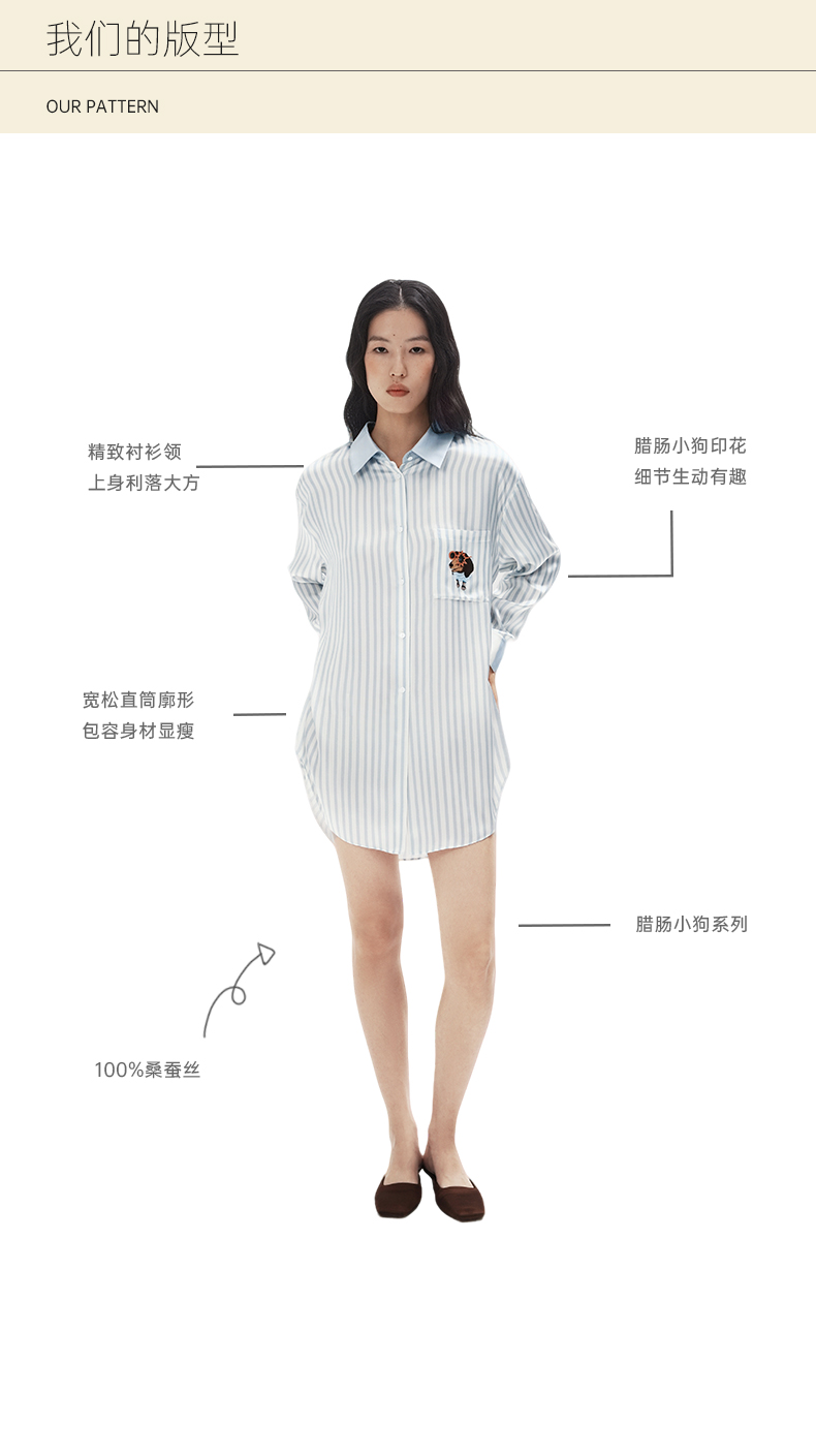 桑罗萌趣旺旺条纹印花衬衫裙桑蚕丝女长袖家居服度假小狗可外穿