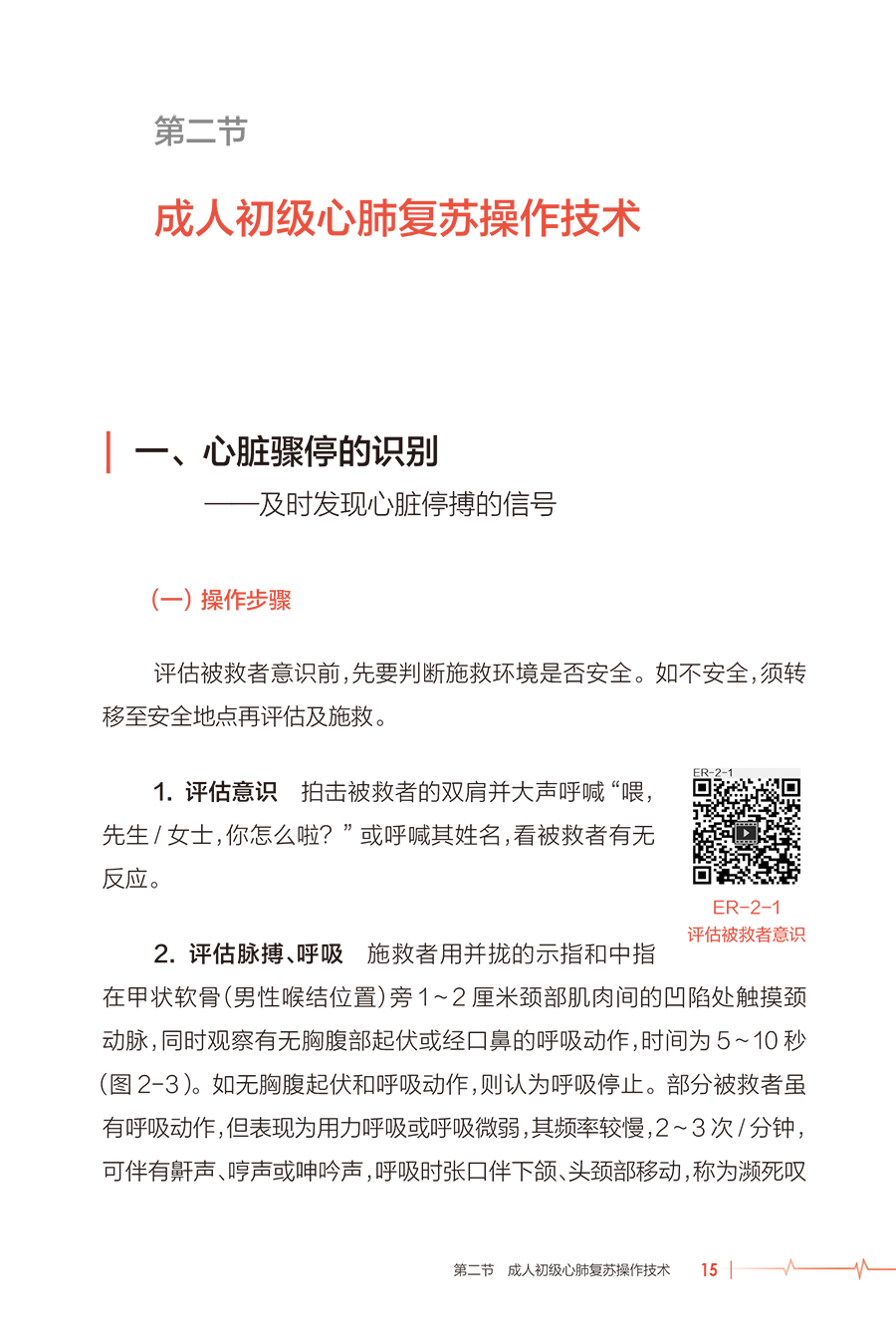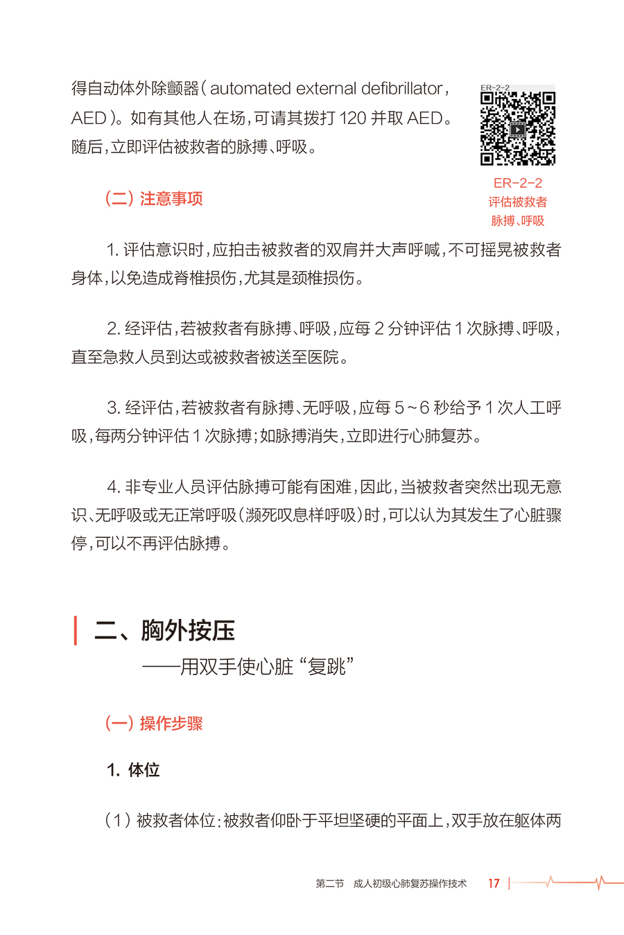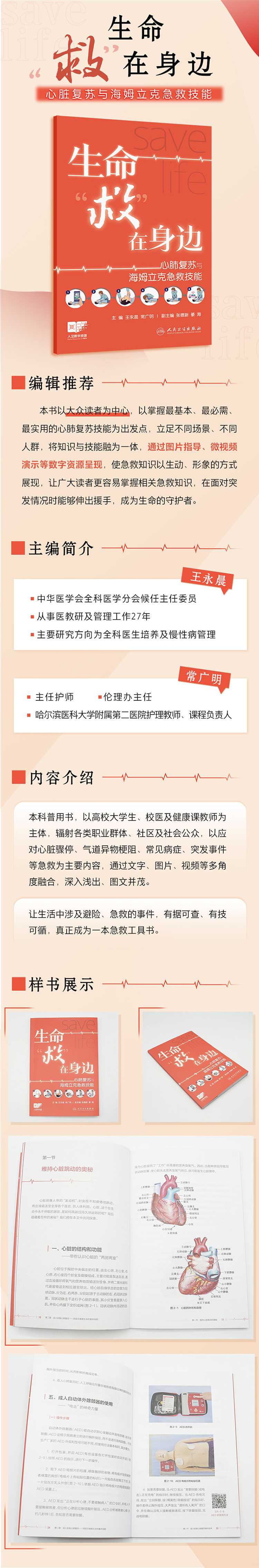 第一章概述生命;救在身边/1一、心肺复苏的起源与发展心肺复苏的前世今生/2二、心肺复苏普及的社会意义重新照亮生命的曙光/4三、急救需要遵循的基本原则危急时刻的施救尺度/6第二章成人初级心肺复苏用双手挽救生命的基本技能/9第一节维持心脏跳动的奥秘/10一、心脏的结构和功能带你认识心脏的;两房两室/10二、心脏跳动的机制及影响因素不受大脑控制的心跳/12三、心肺复苏的原理心肺重启的奥秘/13第二节成人初级心肺复苏操作技术/15一、心脏骤停的识别及时发现心脏停搏的信号/15二、胸外按压用双手使心脏;复跳/17三、开放气道打开救命的呼吸通道/20四、人工呼吸为生命送去急需的氧气/21五、成人自动体外除颤器的使用;电击的神奇力量/24第三节步步为营,稳救生命/27一、成人心肺复苏的完整流程从识别到行动/27二、高质量的心肺复苏如何做到更有效/29三、心肺复苏效果判断心跳重启的信号/30四、何时停止心肺复苏终止操作的条件/30第三章儿童与婴儿的心肺复苏专属于小儿的急救秘籍/33一、儿童与婴儿心脏骤停的识别小小心脏的急救;序曲/34二、儿童与婴儿的胸外按压与成人不同的急救篇章/38三、儿童与婴儿的气道开放守护呼吸的;自由之路/41四、儿童与婴儿的人工呼吸为稚嫩的生命送去希望之息/42五、儿童型自动体外除颤器8岁以下小儿的救命利器/45六、儿童与婴儿心肺复苏指导按部就班地实施救援/45第四章特殊情况的心肺复苏不同环境下的生命守护/49一、孕妇的心肺复苏双重生命守护/50二、创伤的心肺复苏在伤痛中挽救生命/52三、溺水的心肺复苏如何让呼吸恢复/54四、电击的心肺复苏如何唤醒触电后的生命/56五、失温的心肺复苏让生命重回人间/57第五章解除气道异物梗阻疏通生命的;堵路/61一、快速识别气道异物梗阻窒息的危险信号/62二、气道异物梗阻急救原则快速解决气道被堵的困境/62三、解除气道异物梗阻方法海姆立克急救法解除;卡喉危机/63第六章心肺复苏抢救成功经典案例/69案例一:医生在机场成功抢救心脏骤停者/70案例二:女孩在家中成功挽救母亲的生命/72案例三:消防员在海边成功抢救溺水儿童/76