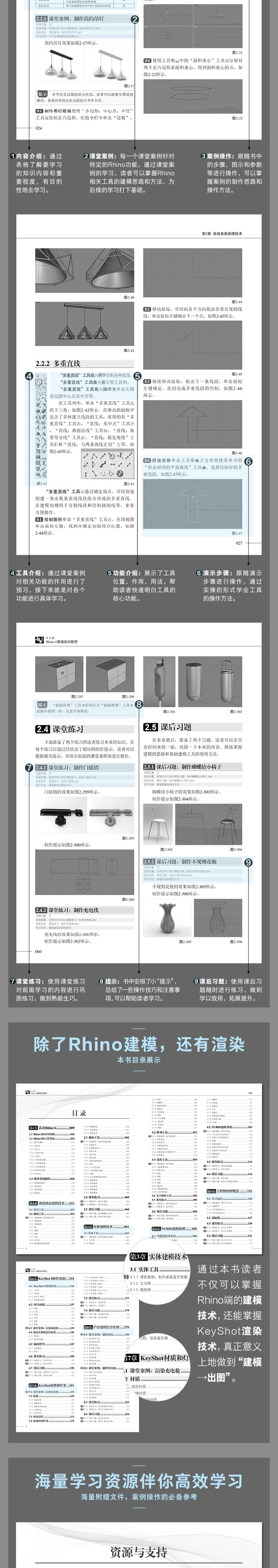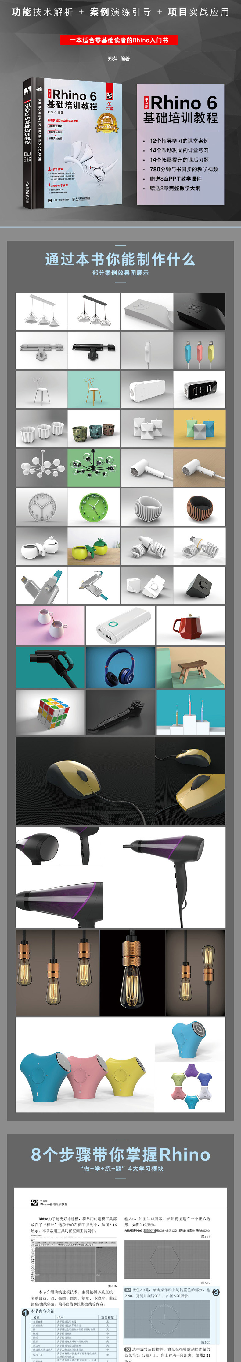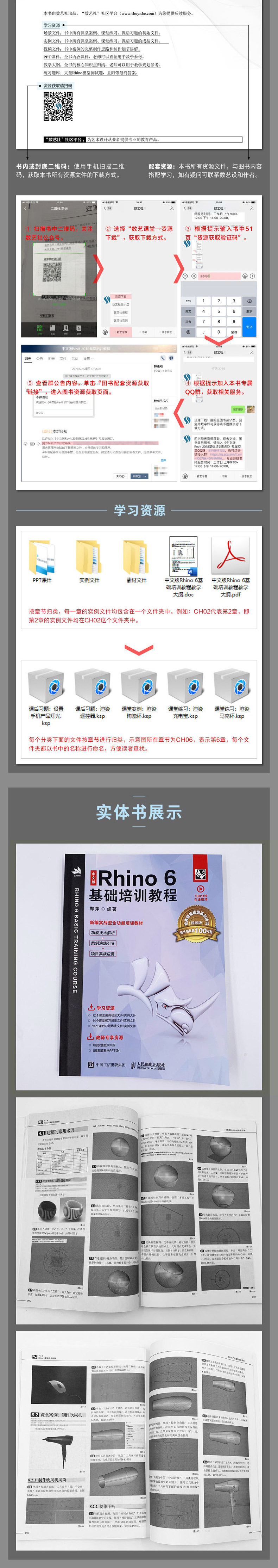 《中文版Rhino 6基础培训教程》重点介绍Rhino的基本操作方法和产品建模的操作技法,包括认识Rhino 6、曲线和曲面建模技术、实体建模技术、NURBS建模原理、工程图出图规范、KeyShot 8操作基础、KeyShot材质和灯光,以及产品建模综合实训等内容。*2~8章安排了多个课堂案例,通过对各案例实际操作的讲解,帮助读者快速上手,熟悉软件功能与产品建模思路。书中的软件功能解析部分可以使读者深入学习软件功能。课堂练习和课后习题可以拓展读者的实际应用能力,提高读者的软件使用技巧。综合实训案例可以帮助读者全面掌握产品模型的建模思路和方法,使读者学会制作简单的工业产品。附带学习资源,内容包括书中课堂案例、课堂练习和课后习题的场景文件、实例文件、视频文件,以及教学PPT课件和教学大纲,读者可通过在线方式获取这些资源,具体方式可参看本书前言。 《中文版Rhino 6基础培训教程》适合作为院校和产品建模培训课程的教材,也可作为Rhino自学人士的参考用书。请读者注意,本书内容均采用Rhino 6编写。