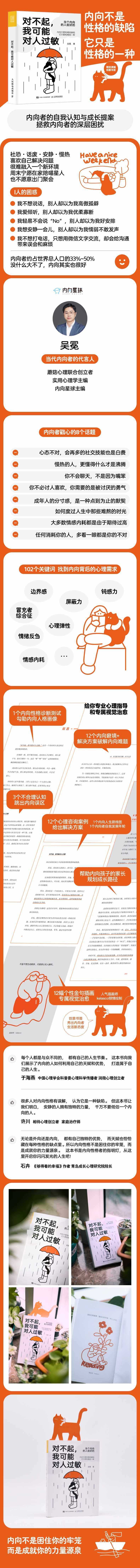 话少,慢热,喜欢安静周末喜欢;宅在家里,不喜欢出去聚会与真正喜欢且信任的人才会成为朋友在人多或喧闹的环境中待久了会感觉很累与人沟通时喜欢用文字,不喜欢打电话或发语音... ...内向,不是困住你的牢笼,而是成就你的力量源泉。内向者的自我认知与成长提案,拯救i人的深层困扰,帮助内向的_quot;社恐星人_quot;摆脱人际交往、亲密关系和职场成长中的现实困境。1.百万粉丝实用心理学主编力作。2.1个内向人格画像,1个内向性格诊断测试,12个内向心理咨询指导案例,102个心理学关键词。3.3个不合理认知:跳出内向误区;12个内向窘境和解决方案:帮助内向者摆脱人际交往、亲密关系和职场成长中的现实难题。4.1个延伸阅读:1个内向人生路线图 1个内向者自我发展年轮,帮助内向者以及有内向孩子的家长主动规划生活方式和成长路径。5.绘本插画板块:个性;撸猫插画配金句,给你视觉治愈。6.创意书签,秀出内向者生活态度。