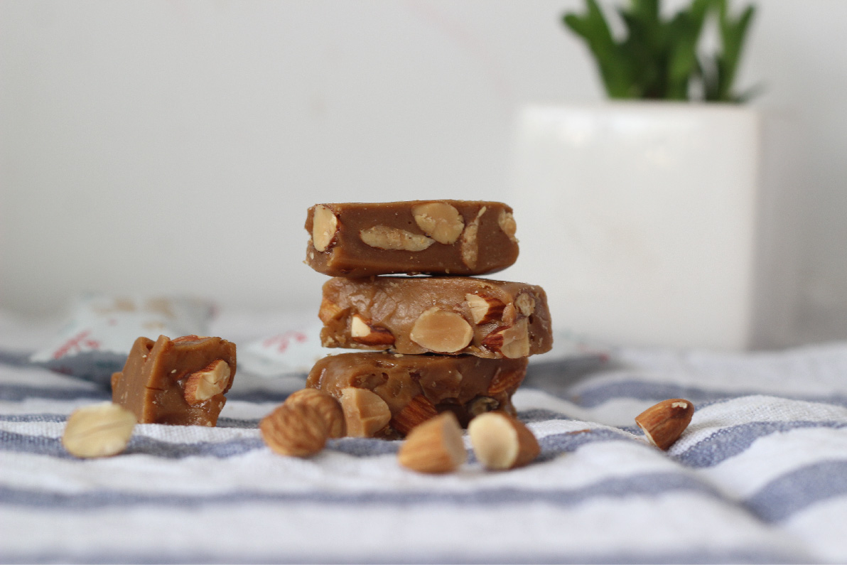 大颗粒杏仁(巴旦木),与慢熬太妃酱交融,冷却后创造出脆香的太妃糖。