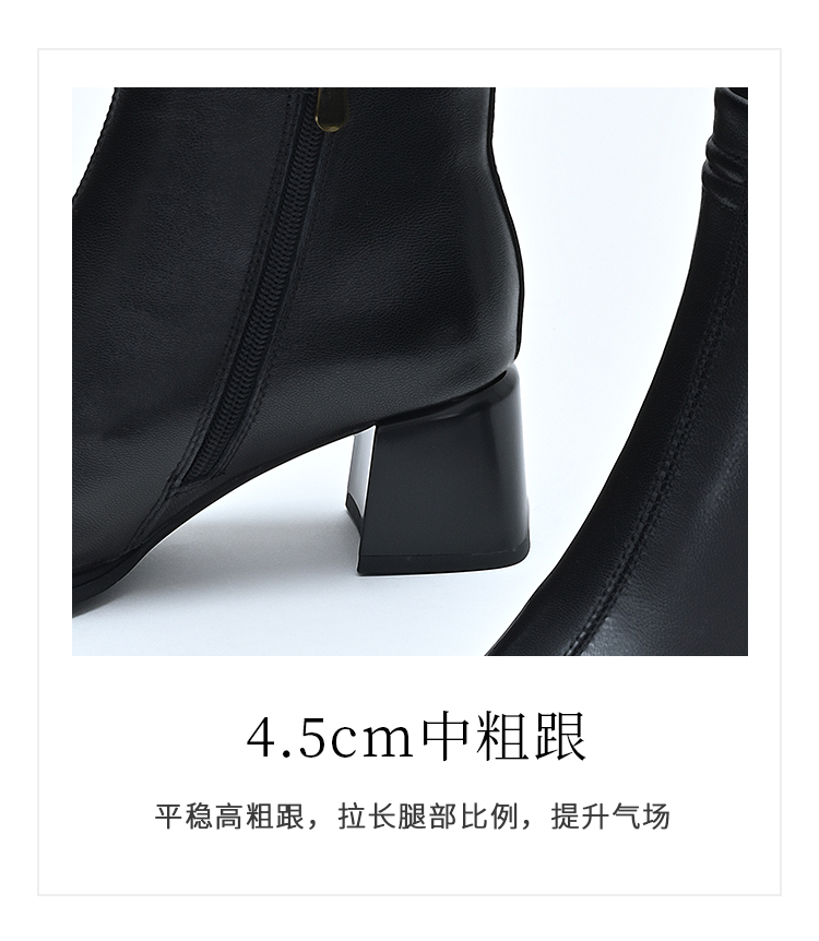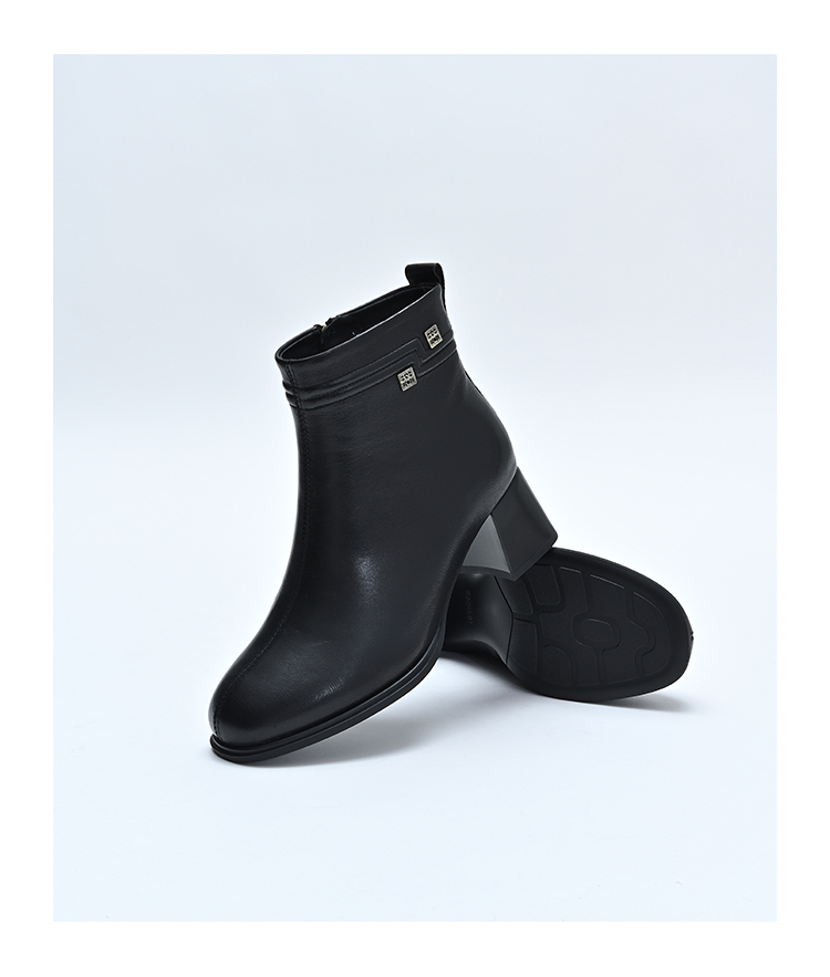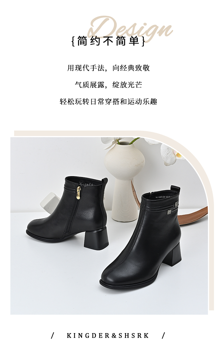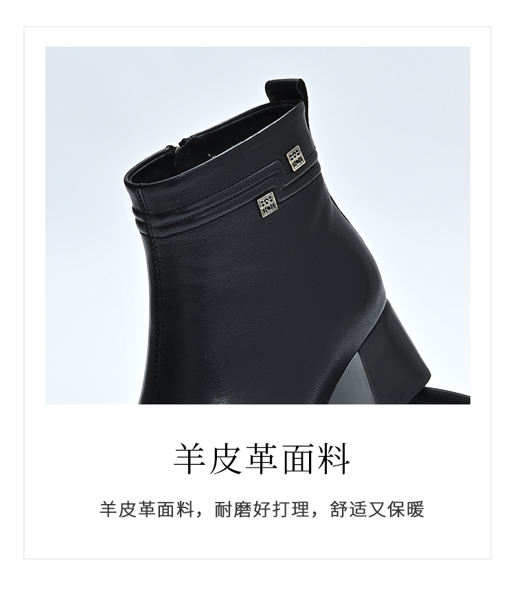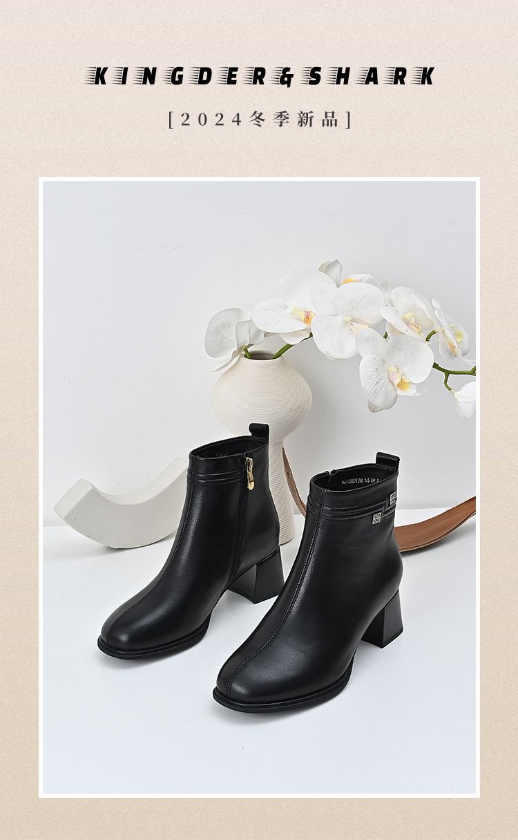 经典鲨2024年冬季新款百搭黑色侧拉链加绒中粗跟显瘦短靴女KD29-D58091