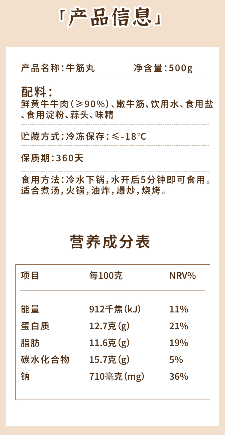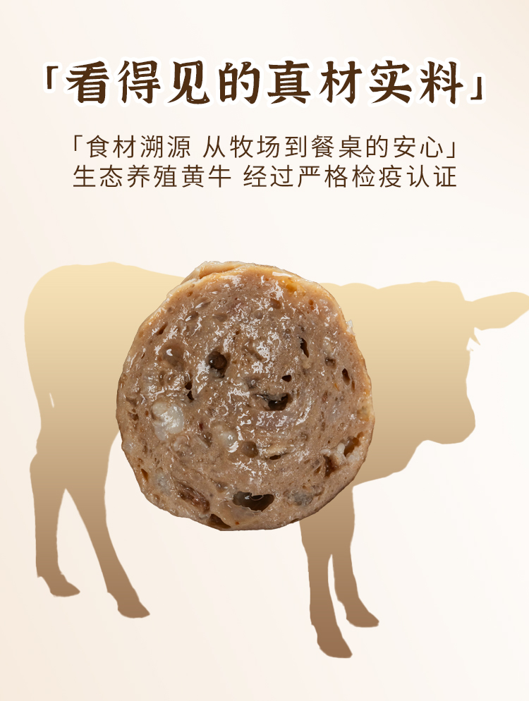 【配料表】鲜黄牛牛肉(≥90%),嫩牛筋,饮用水,食用盐,食用淀粉,蒜,味精