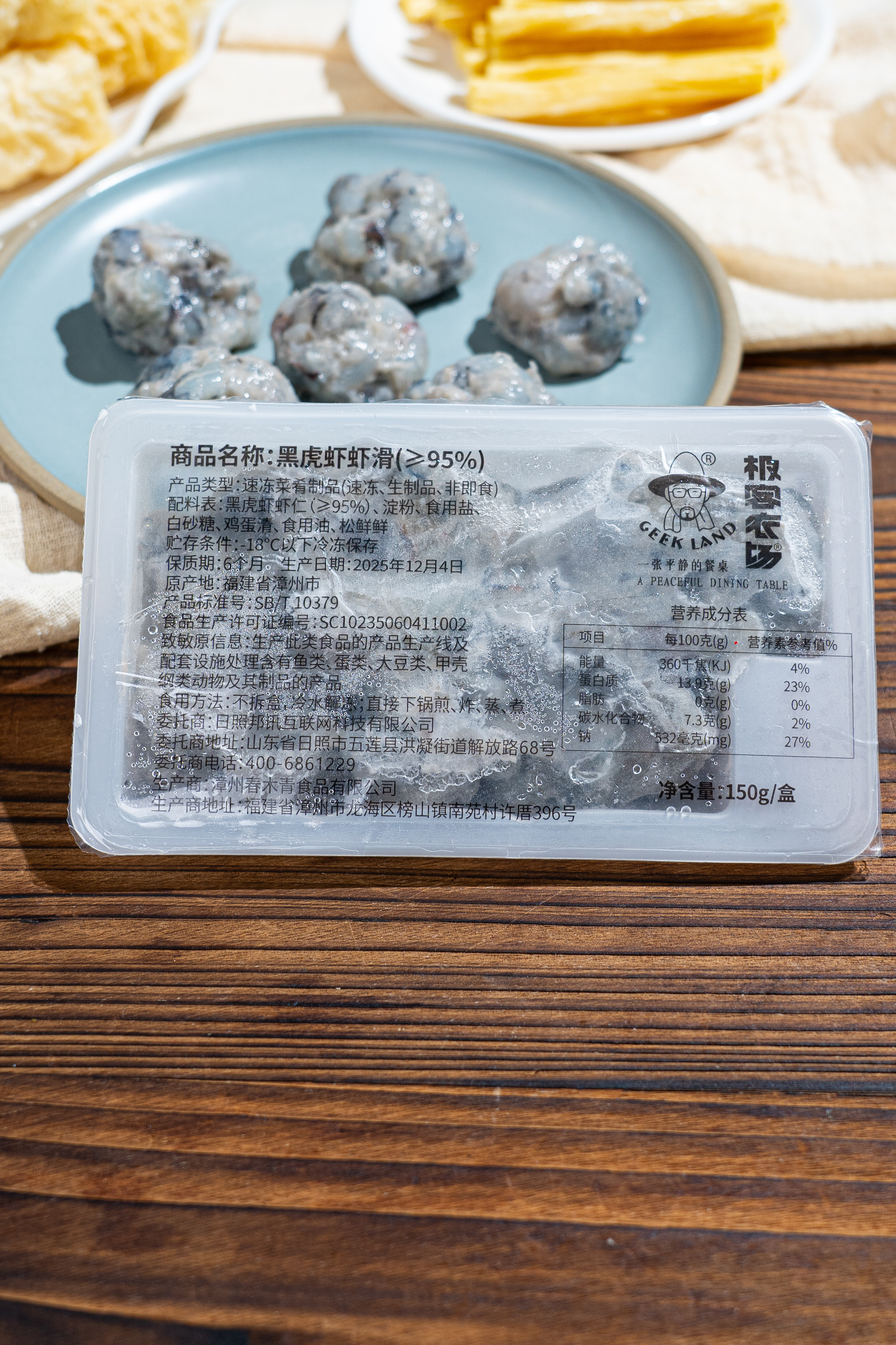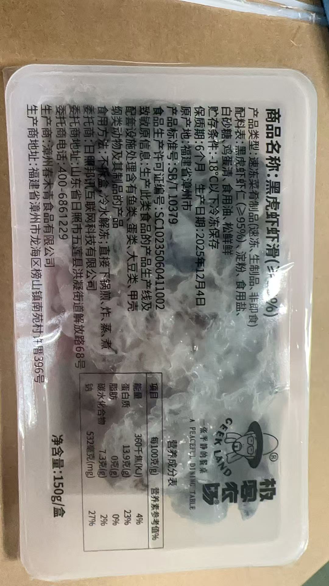 【配料表】黑虎虾虾仁(≥95%)、马铃薯变性淀粉、食用盐、白砂糖、鸡蛋清、食用油、鸡精;