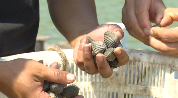到了冬季,大伙儿就会齐齐下塘,拿着特有的工具捕获血蚶。