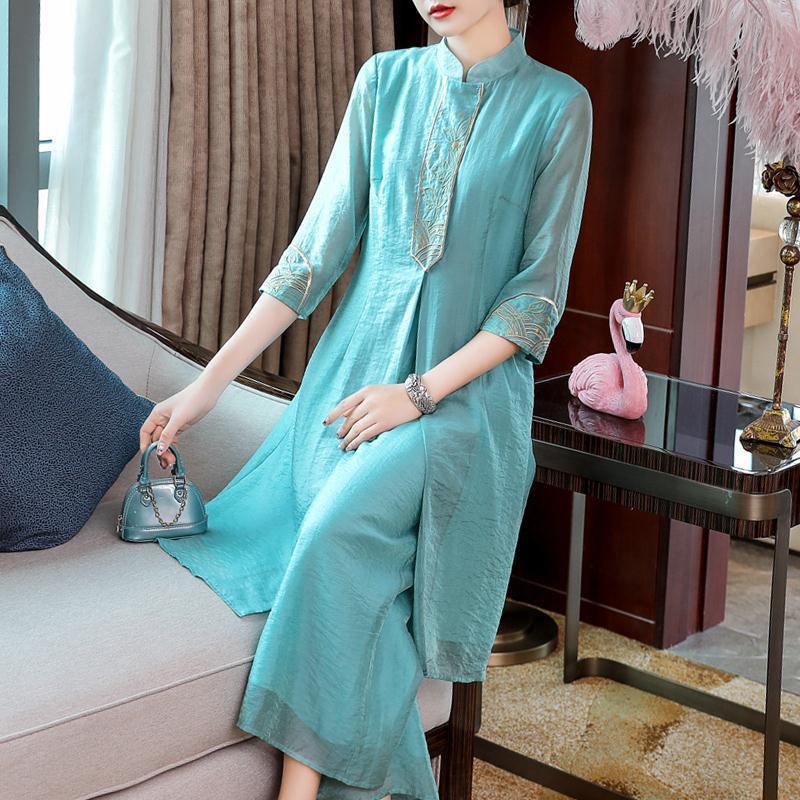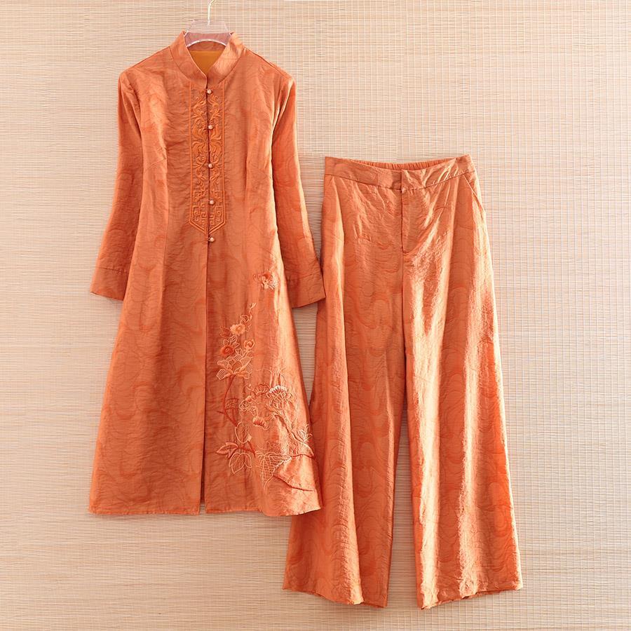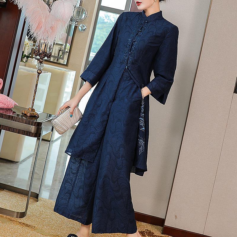 PDD-MQNZ210505新款复古优雅气质修身中长款刺绣上衣阔腿裤两件套