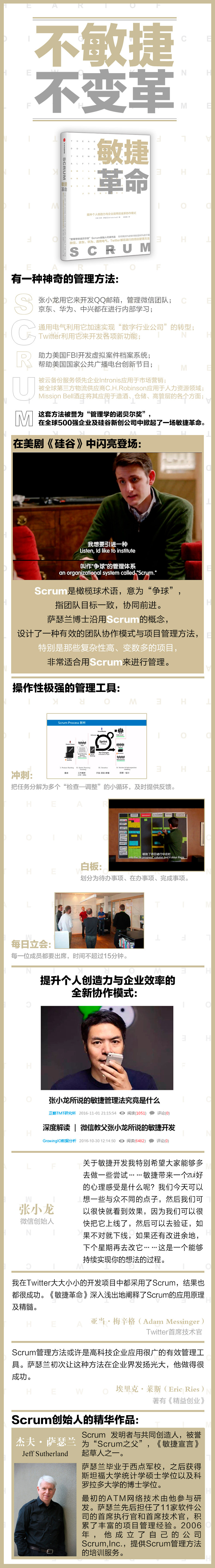 萨瑟兰创造了一种高效的工作流程,能很大地提高工作效率,降低员工的挫败感,规避常见的错误。《敏捷革命》透彻地阐释了为什么Scrum适用于众多行业。