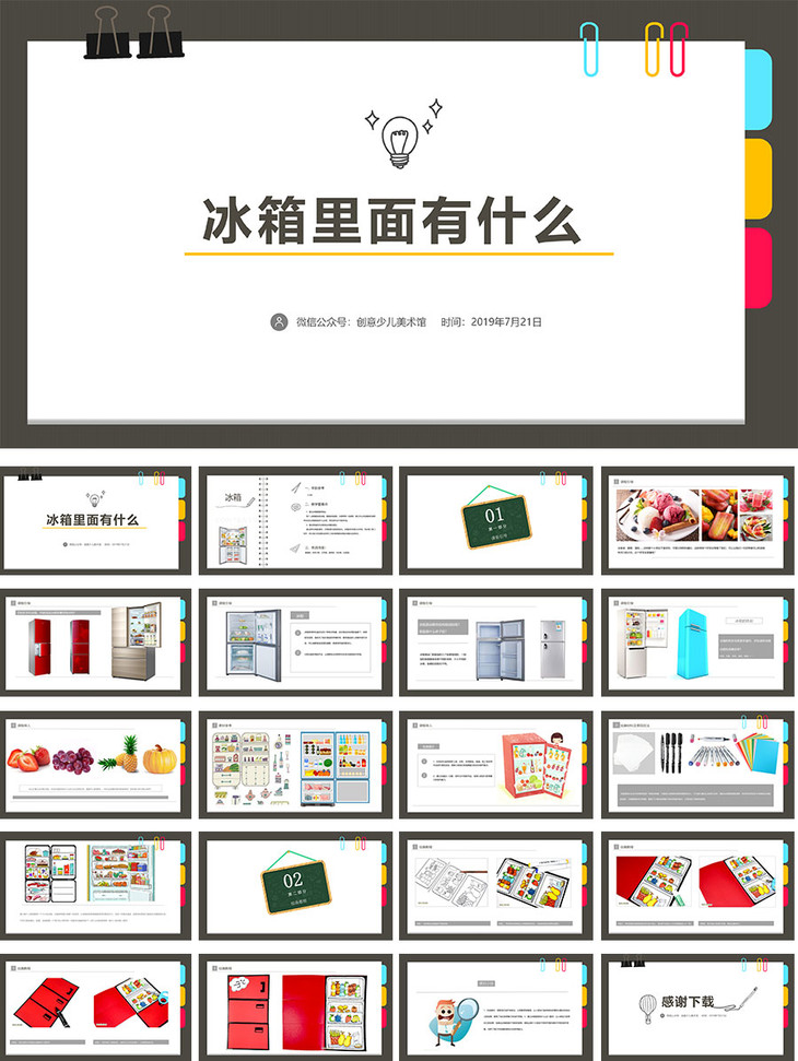 每个人家里都会有冰箱,里面放的有蔬菜、水果等等一些食物,我们可以在绘画的时候思考你会在冰箱里放些什么东西,然后创作出不同的作品。