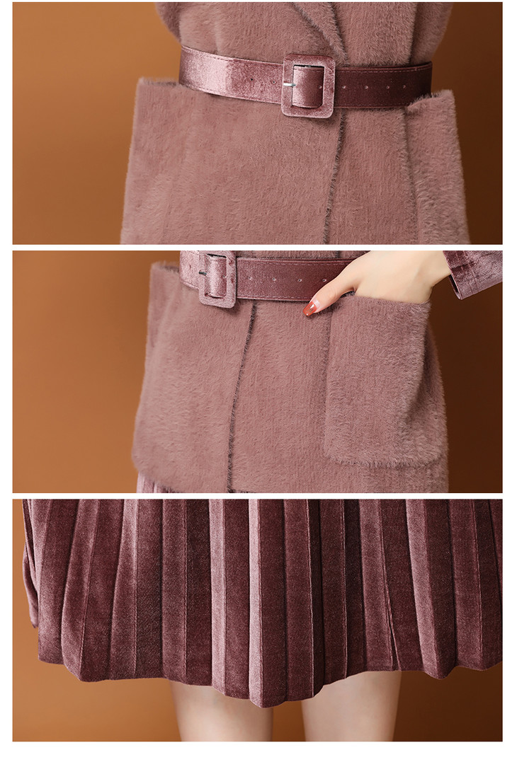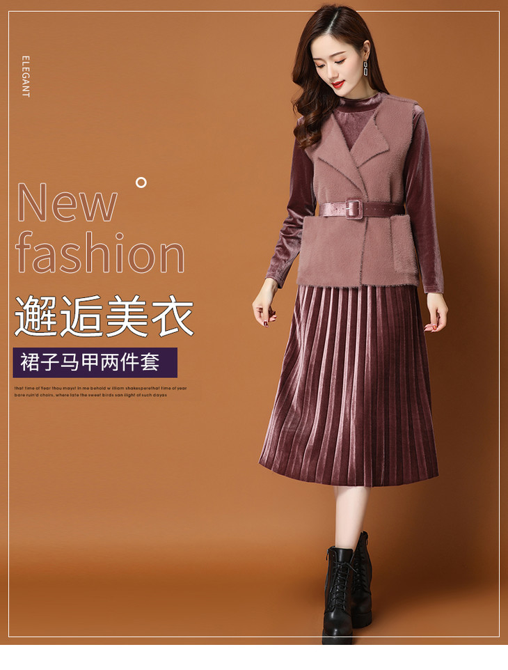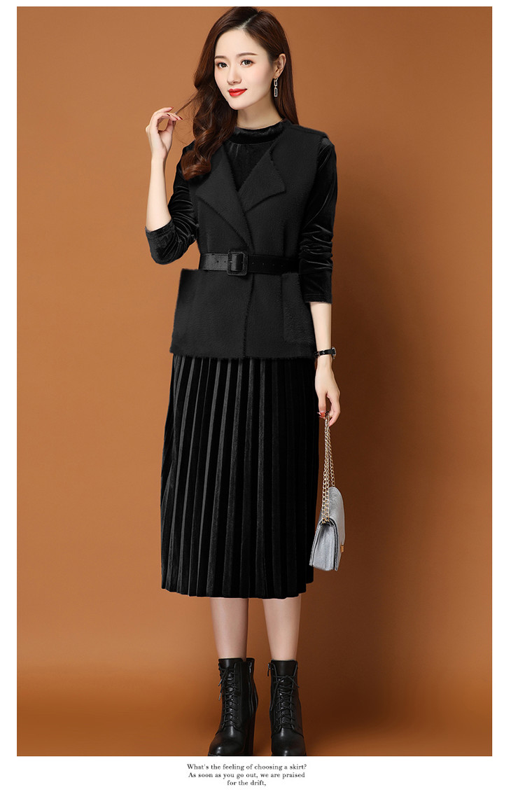 PY-62021 秋冬新款时尚纯色长款女式百褶裙搭配貂毛马甲气质百搭两件套