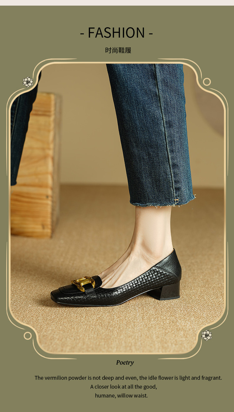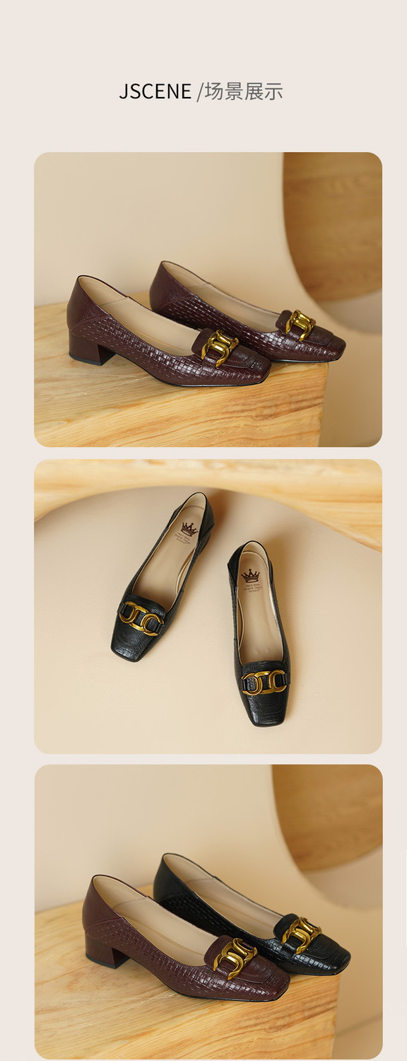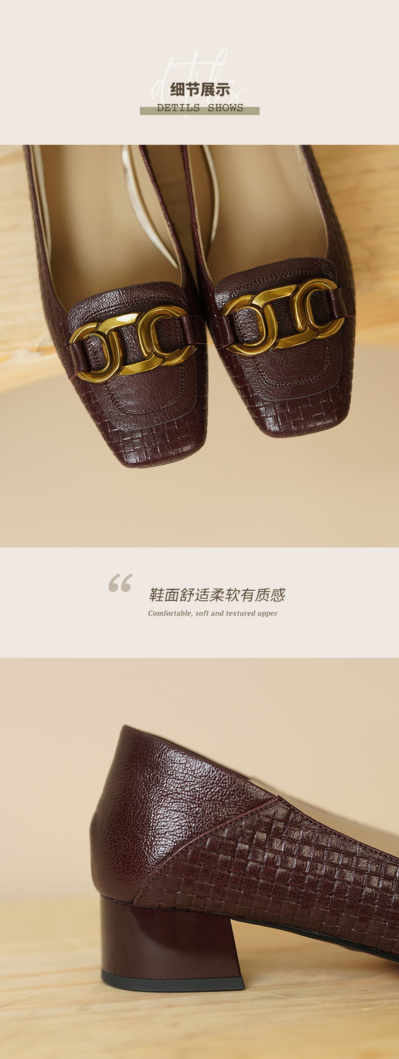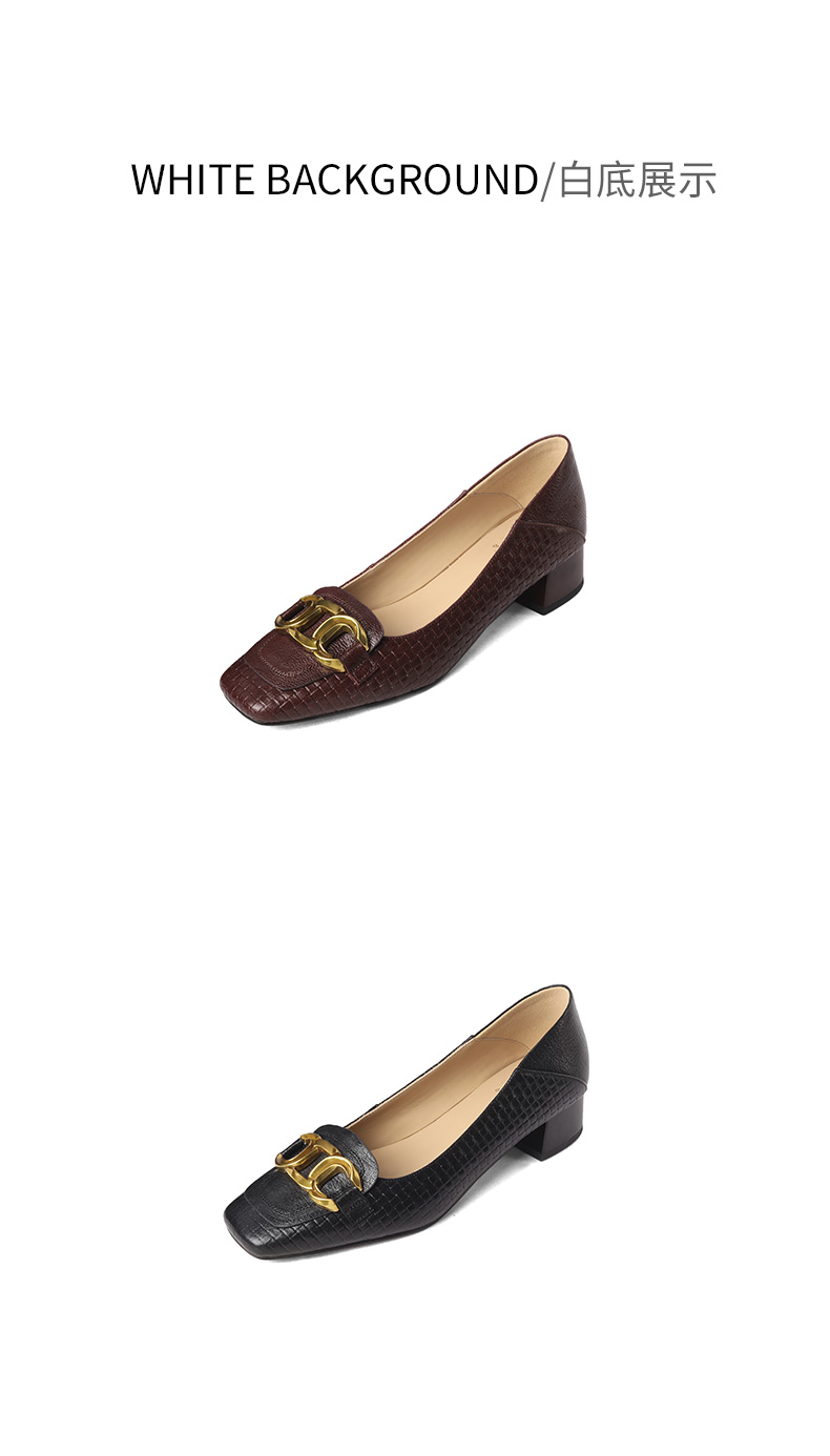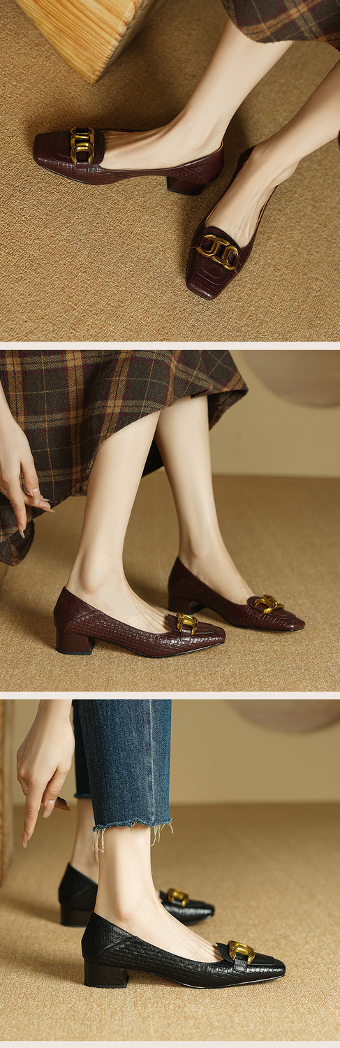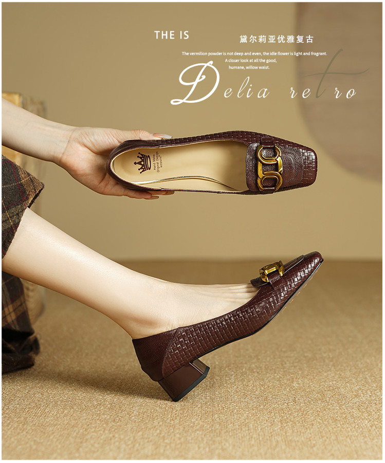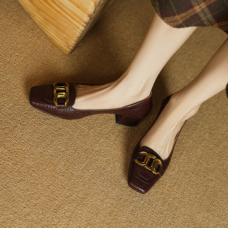 【预售5天】秋季新款方头单鞋女浅口中跟鞋粗跟金属方扣复古棕色XKDY&X5660